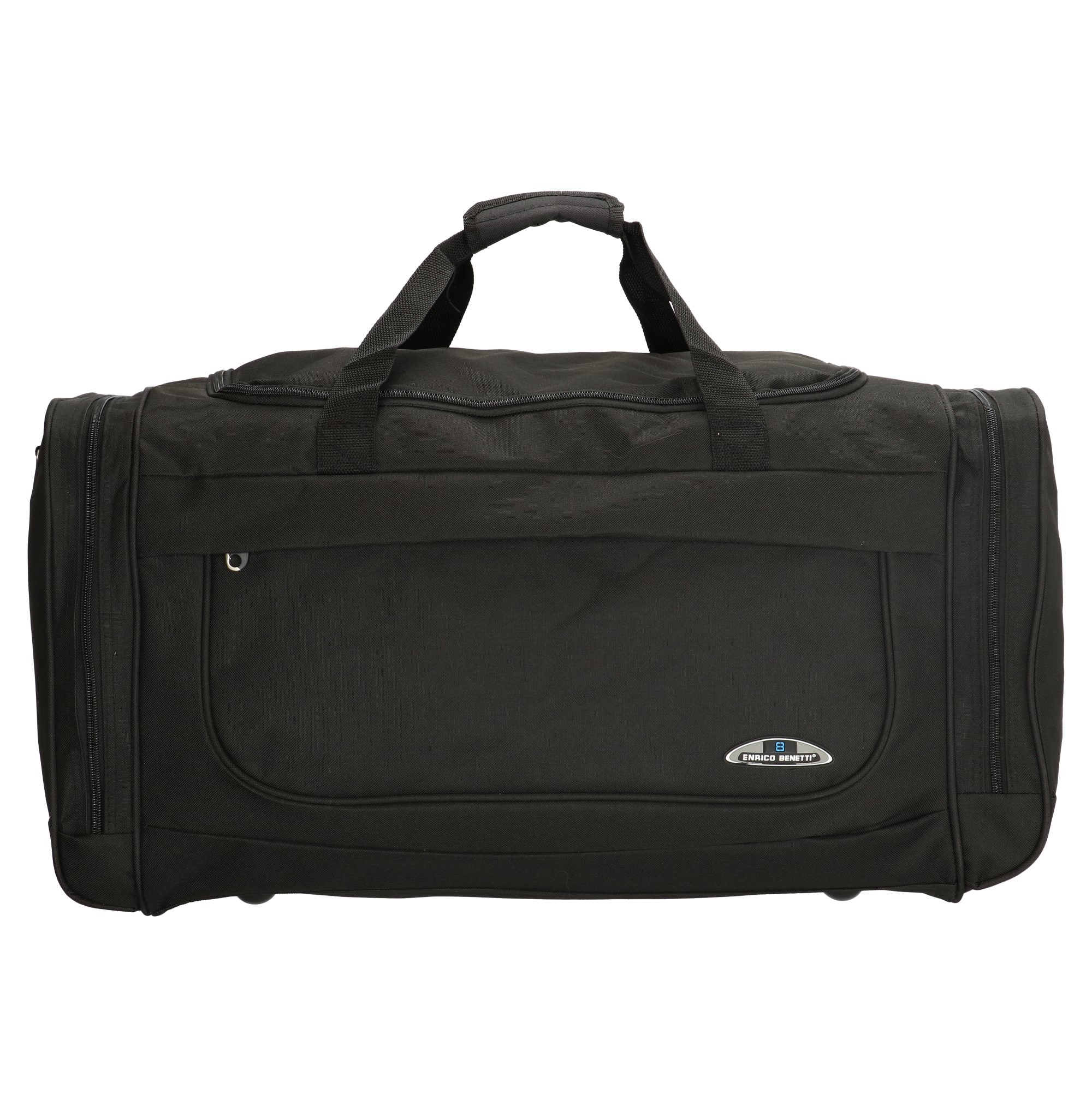 Veľká čierna cestovná látková taška od značky Enrico Benetti. Do tašky sa zbalíte aj na mesiac. Dobre poslúži aj ako taška na šport. Hlavné vrecko má dvojsmerný zips. Dno je vystužené z vnútornej strany. Uši sú pevné a nechýba odnímateľný, nastaviteľný popruh na nosenie cez plece. Z vonkajšej strany je dno chránené cvočkami proti odreniu. Menšie vrecká sú na prednej strane a po bokoch.