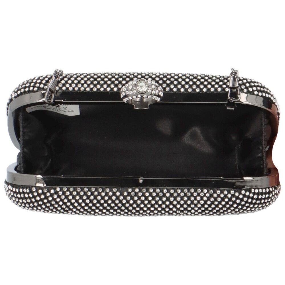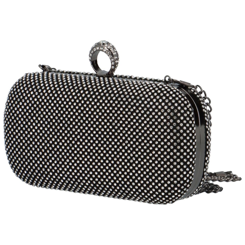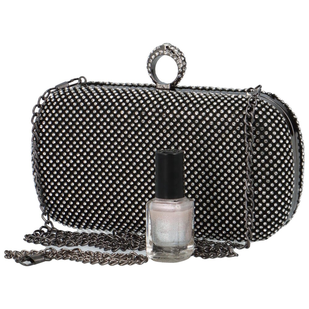 Luxusná čierna listová kabelka do ruky s kamienkami, ktoré rozžiaria vaše sviatočné aj večerné šaty. V kovovom rámčeku sa ukrýva zapínanie v podobe prsteňa. Listová kabelka vyzerá úchvatne keď do prsteňa vložíte prst, a tak ho môžete nosiť v ruke. Môžete však pripnúť aj jemnú retiazku a nosiť listovú kabelku pohodlne cez plece. Značka Moon. Tak objednajte ešte dnes a vyskúšajte! Vrátiť ju môžete do 30tich dní.