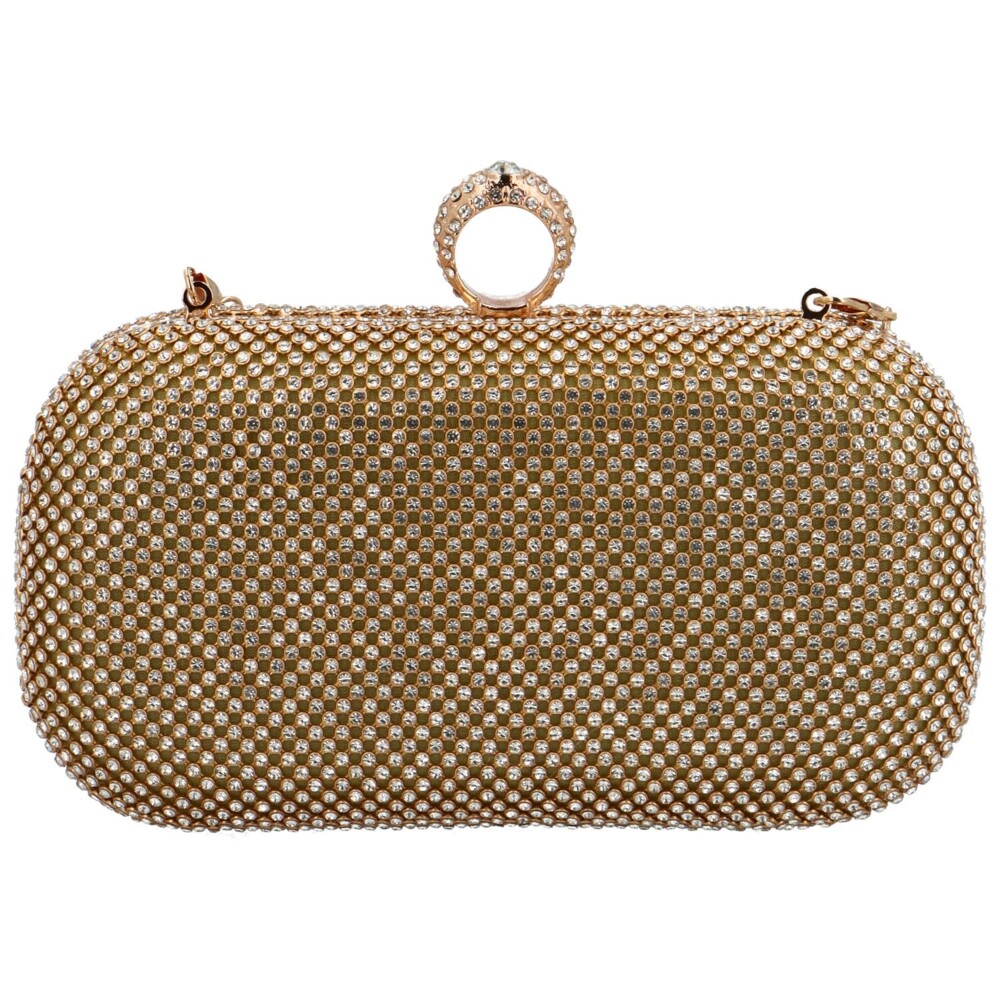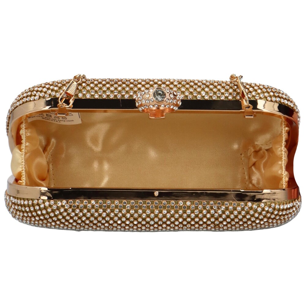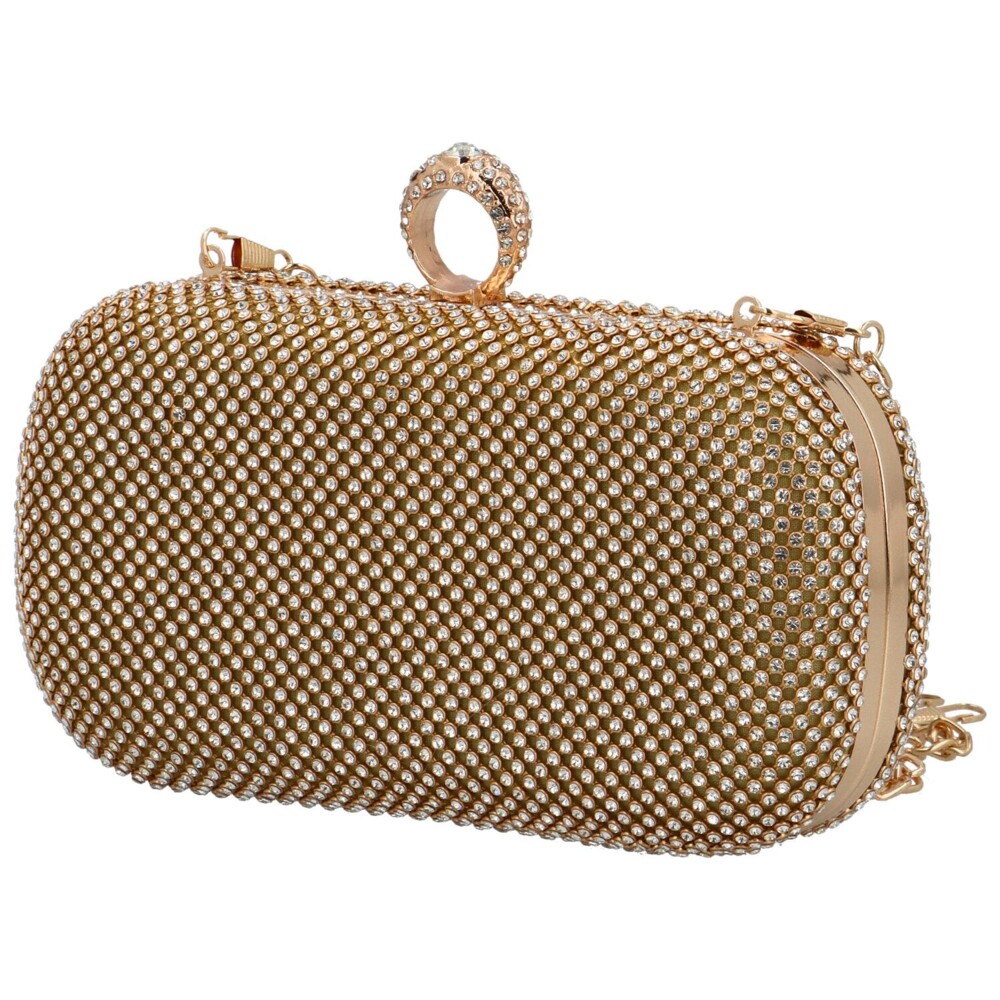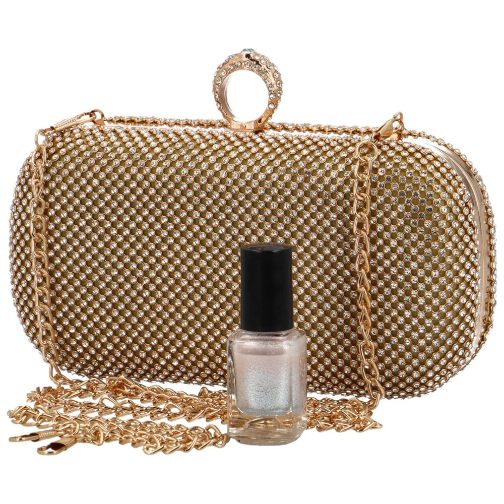 Luxusná zlatá listová kabelka do ruky s kamienkami, ktoré rozžiaria vaše sviatočné aj večerné šaty. V kovovom rámčeku sa ukrýva zapínanie v podobe prsteňa. Listová kabelka vyzerá úchvatne keď do prsteňa vložíte prst, a tak ho môžete nosiť v ruke. Môžete však pripnúť aj jemnú retiazku a nosiť listovú kabelku pohodlne cez plece. Značka Moon. Tak objednajte ešte dnes a vyskúšajte! Vrátiť ju môžete do 30tich dní.