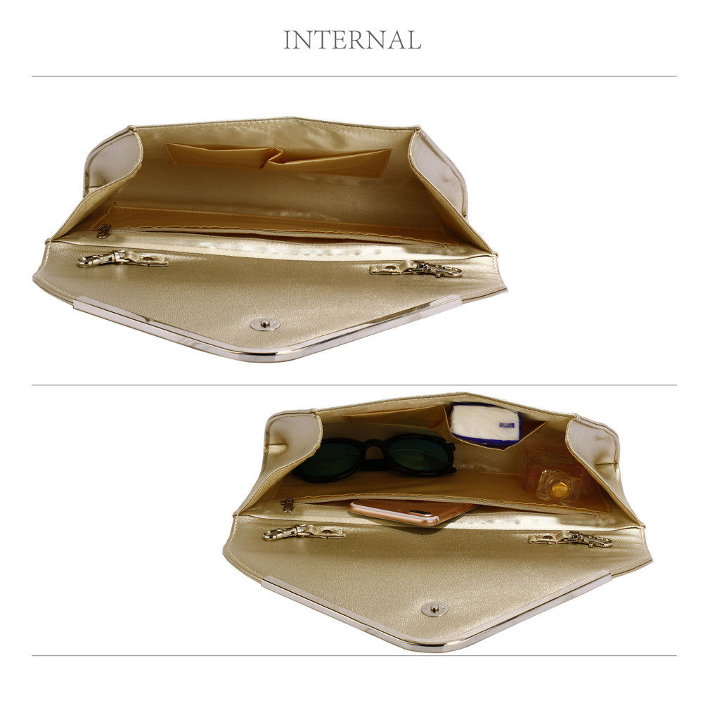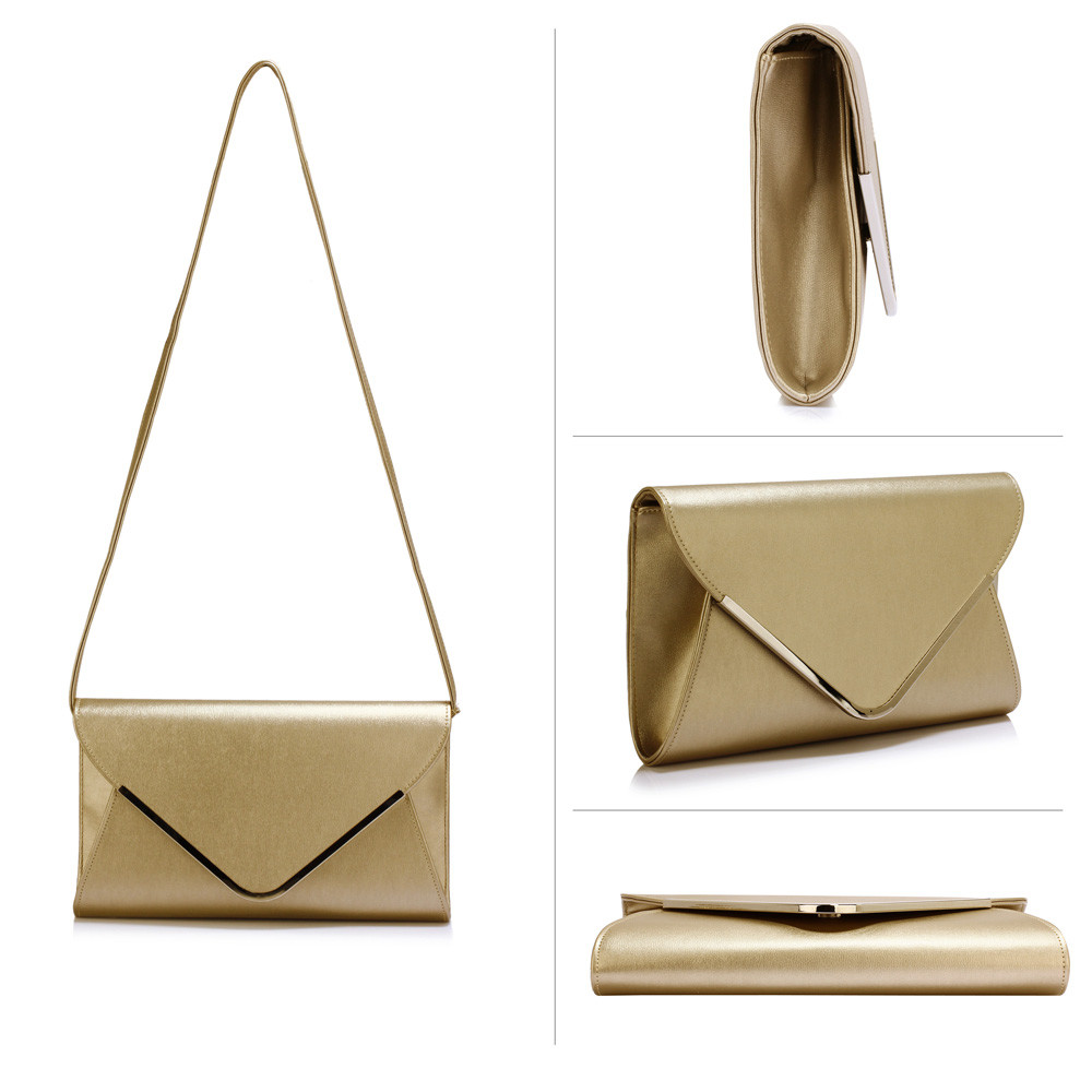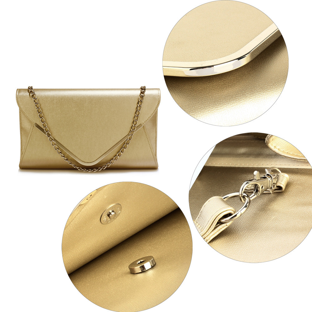 Elegantná zlatá listová kabelka LS Fashion so striebornými kovovými detailmi pre všetky spoločenské príležitosti by nemala chýbať žiadnej žene, ktorá si nechá záležať na spoločenskom outfite. Vnútri sú menšie kapsičky bez zipsu a jedno vrecko na zips. Súčasťou kabelky je odnímateľná strieborná retiazka. Listovú kabelku možno nosiť v ruke alebo cez rameno. Veľmi elegantný doplnok na svadby, plesy, recepcie ...