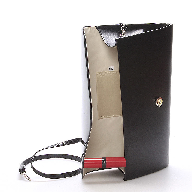Veľká čierna luxusná matná listová kabelka od značky Delami so zaoblenou lesklou príklopkou Vám nesmie chýbať. Či už na večierky, do spoločnosti alebo na večeru s partnerom. Urobte si radosť, alebo urobte radosť práve Vašej partnerke. Buďte hviezdou večera .. Listovú kabelku možno nosiť na ramene vďaka popruhu, ale padne aj do ruky. Zapína sa pomocou magnetického gombíku. Vnútri sa nachádza malé voľné vrecko.