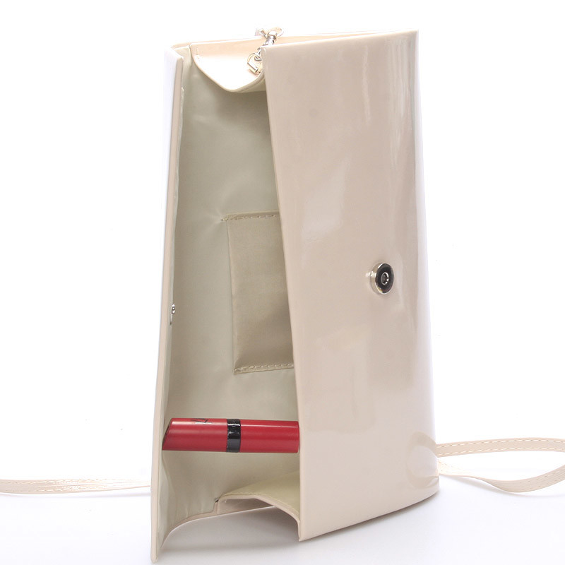 Štýlový vzhľad béžovej listovej kabelky Delami v lesklom prevedení s nerovnou chlopňou určite zaujme nejednu ženu a ak hľadáte priestor, je Charlien to pravé! Listová kabelka je veľká, možno nosiť cez rameno vďaka popruhu, ale padne aj do ruky. Zapína sa pomocou magnetického cvočku. Vnútri sa nachádza malé voľné vrecko.