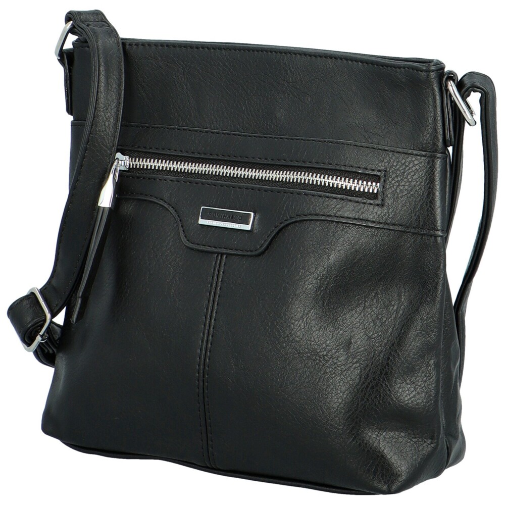 Štýlová čierna mäkká kabelka s pevnejším dnom Vás doplní pri každodenných činnostiach. Hlavné vrecko je na zips a vo vnútri nájdete malé bočné kapsičky v podšívke. Priestor delí stredové zipsové vrecko pre lepšie usporiadanie vašich vecí. V zadnej časti je kapsička na zips, pre rýchly prístup. Predný diel zdobí strieborné logo značky Romina & Co a strieborné zipsové vrecko. Kabelka má dlhý, nastaviteľný popruh, a tak ju môžete nosiť cez rameno, ale aj do kríža. Objednajte ešte dnes a vyskúšajte! Vrátiť ju môžete až do 30 dní!