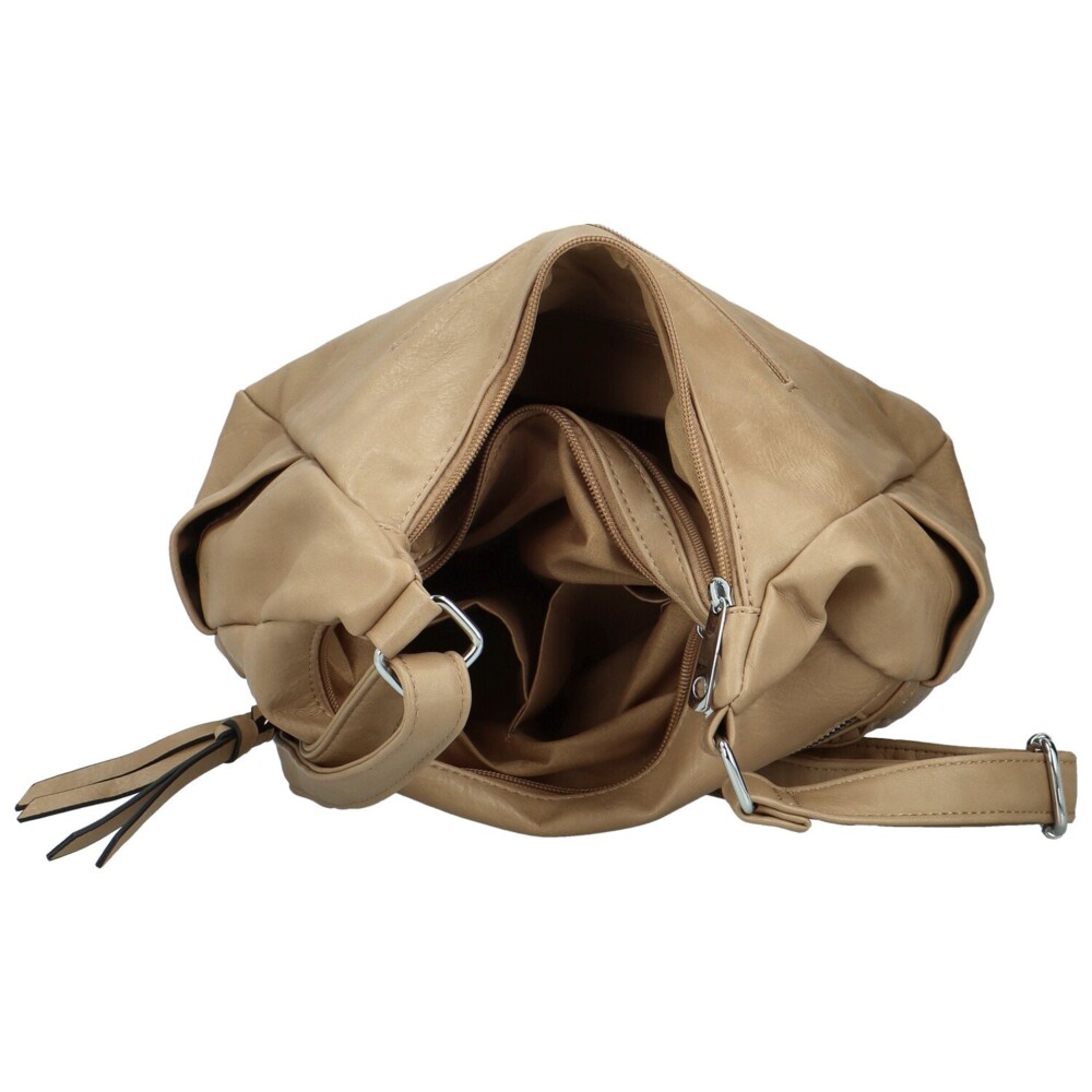 Táto kabelka je veľmi praktická a zároveň štýlová. Kabelka má zaoblený tvar a je vyrobená z jemne štruktúrovanej syntetickej kože. Na prednej strane sa nachádzajú menšie vrecká na strieborný zips. Oba zipsy majú koženkové ťaháčky pre ľahké otváranie. Kabelka má aj jemné zvislé prešitie, ktoré pridáva na vizuálne zaujímavosti. Kabelka má hneď dve hlavné vrecká do ktorých si všetko krásne rozvrhnete a zaistíte zipsy. Ďalšie menšie otvorené vrecká sú po stranách. Posledné zipsové vrecko je na zadnej strane. Nastaviteľný popruh umožňuje pohodlné nosenie cez rameno aj krížom cez telo. Kovové detaily vo farbe striebra dodávajú kabelke moderný nádych. Vďaka svojmu členeniu a veľkosti je ideálny na každodenné nosenie. Objednajte ešte dnes a vyskúšajte, vrátiť ju môžete až do 30 dní!