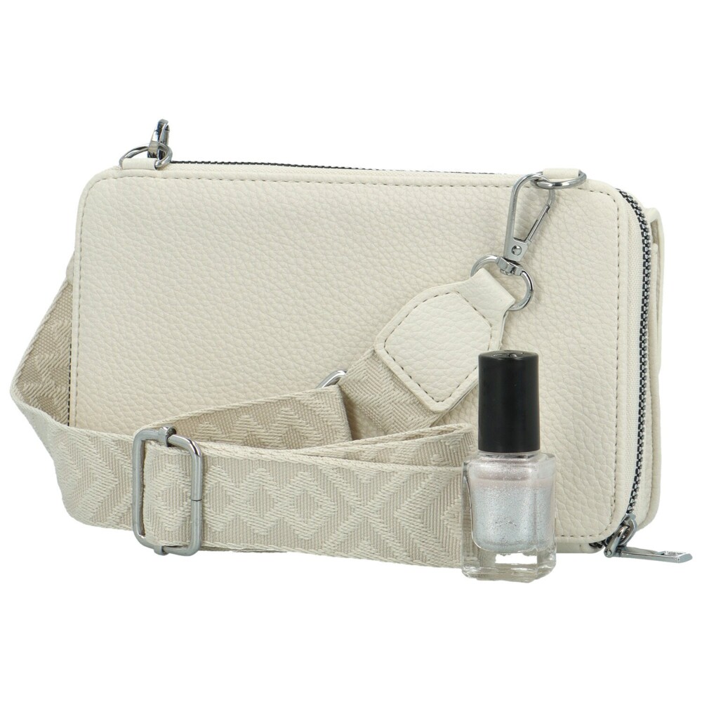 Moderná krémová dámska crossbody minikabelka z veľmi príjemnej koženky. MaxFly. Je navrhnutá podľa posledných módnych trendov. Dá sa využiť ako malá crossbody alebo väčšia peňaženka. Na prednej strane je chlopňa na cvok, pod ktorou je voľné vrecko na vaše drobnosti. V zadnej časti je zipsové vrecko, ktoré ponúka menšie vrecká pre doklady aj peniaze. Vnútri je aj malé zipsové vrecko na mince. Ku kabelke je dlhý, textilný popruh, ktorý umožní nosenie cez rameno aj do kríža. Farebne ladí s kabelkou. Po odopnutí popruhu môžete kabelku využiť ako peňaženku do väčšej kabelky. Tento kúsok zdobí strieborné kovanie a strieborné logo na prednej strane. Objednajte ešte dnes a vyskúšajte! Vrátiť ju môžete až do 30 dní!