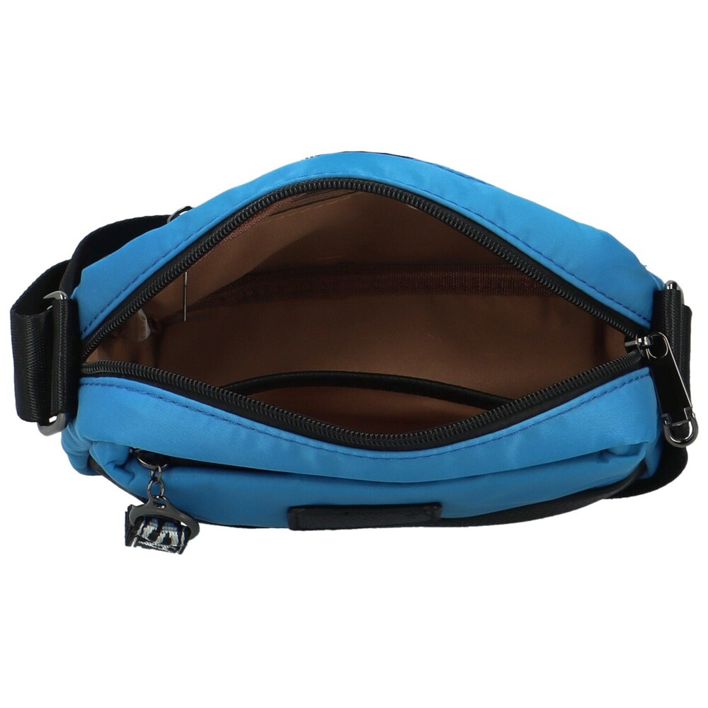 Dámska modrá crossbody kabelka Firenze v modernom a športovom štýle. Praktický strih a príjemná textília. Táto crossbody ľahko oživí váš športovejší outfit. Na prednej aj zadnej strane nájdete menšie vrecká na drobnosti, ktoré zaistíte zipsom. Hlavný úložný priestor je na zips, vo vnútri nájdete vrecko na zips a v podšívke otvorené priehradky. Široký látkový široký popruh z odolnej textílie, podčiarkuje uvoľnený dojem z tohto modelu. Kovanie je strieborné. Tak objednajte ešte dnes a vyskúšajte! Vrátiť ju môžete do 30 dní.