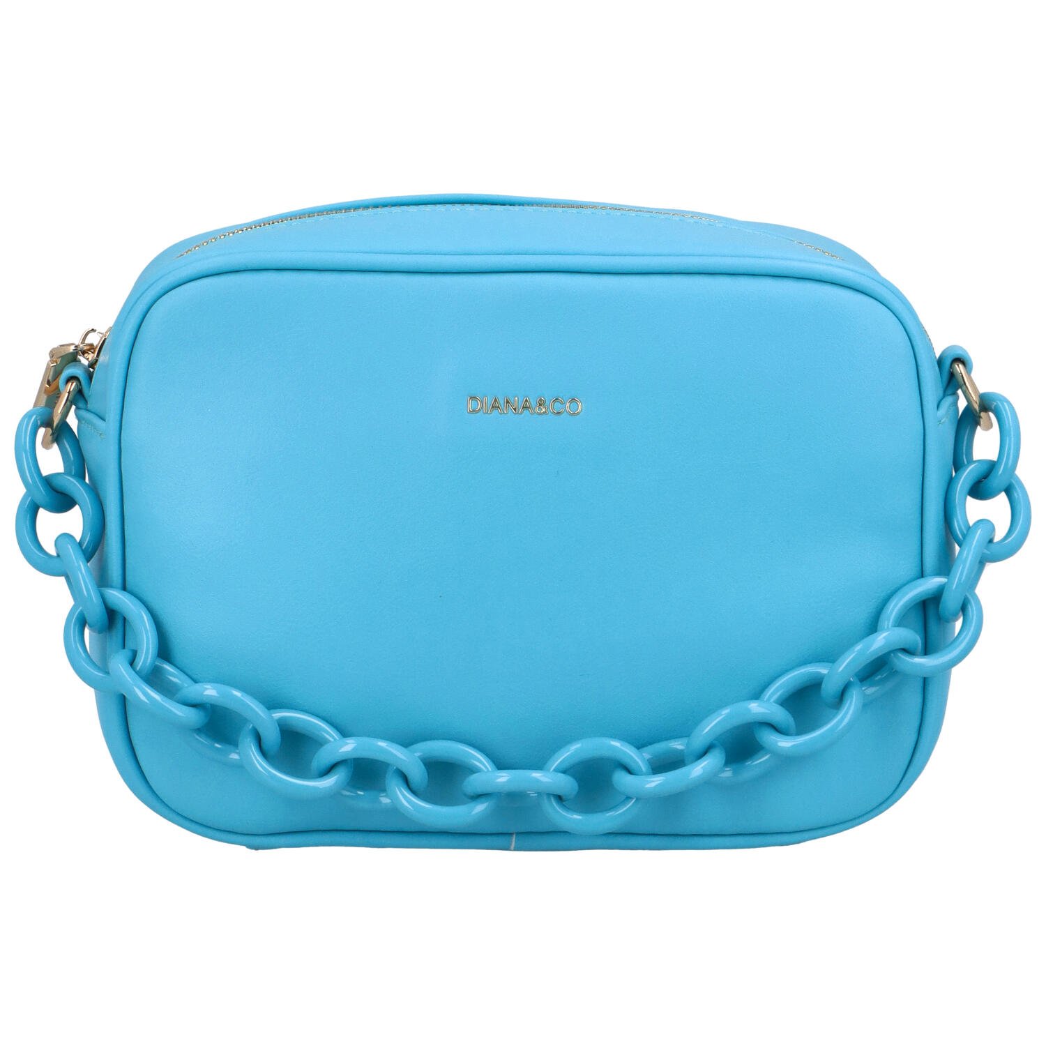 Moderná horúca novinka na našom eshope od značky DIANA & CO. Objednajte ešte dnes a vyskúšajte! Vrátiť ju môžete až za 30 dní! Malá dámska crossbody kabelka v nebesky modrej farbe. Ucho kabelky je z krúžkov vo farbe kabelky, rovnako farebný je aj jej popruh, vďaka ktorému ju môžete nosiť cez plece alebo crossbody. Nosiť ju možno aj za krúžkové ucho v ruke alebo na predlaktí. Hlavné vrecko je na zips, ďalšie vrecká, kam uložíte drobnosti, sú vo vnútri aj na zadnej strane kabelky.