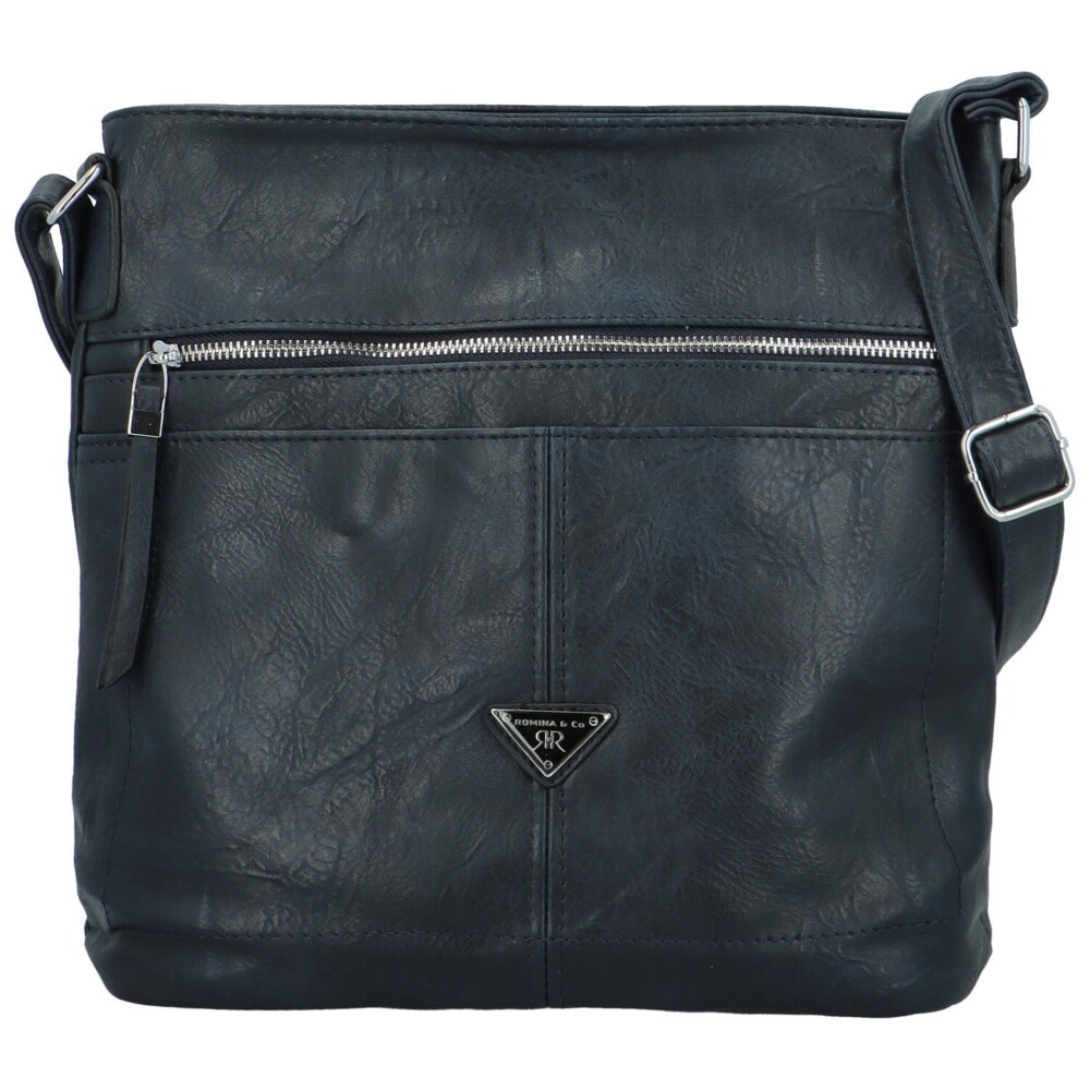 Trendy crossbody kabelka z kvalitnej hladkej syntetickej kože v tmavomodrej farbe, od obľúbenej značky Romina & Co. Bags. Predná strana disponuje vodorovným zipsovým vreckom a trojuholníkovým logom značky v striebornej farbe. Hlavný priestor uzavriete zipsom. Vnútri je stredové zipsové vrecko, ktoré vám zaistí praktické rozvrhnutie vašich vecí, na to vám poslúžia aj menšie bočné vrecká v podšívke. Na zadnej strane je tiež malé zipsové vrecko, pre rýchly prístup. Popruh je koženkový, dlhý a jeho dĺžka sa dá regulovať. Kabelku môžete nosiť cez rameno, ale aj ako crossbody do kríža. Strieborné kovanie dopĺňa jemný vzhľad kabelky. Objednajte ešte dnes a vyskúšajte! Vrátiť ju môžete až do 30 dní!