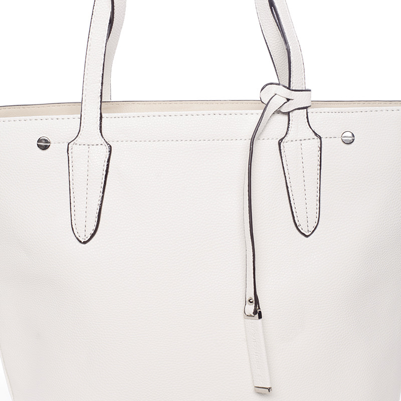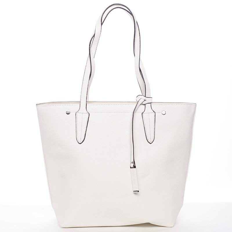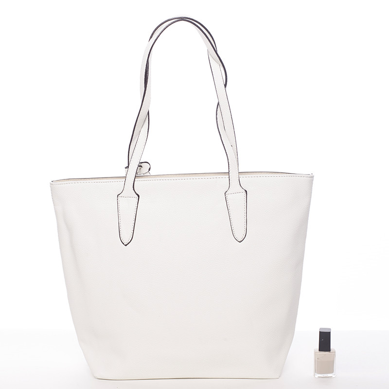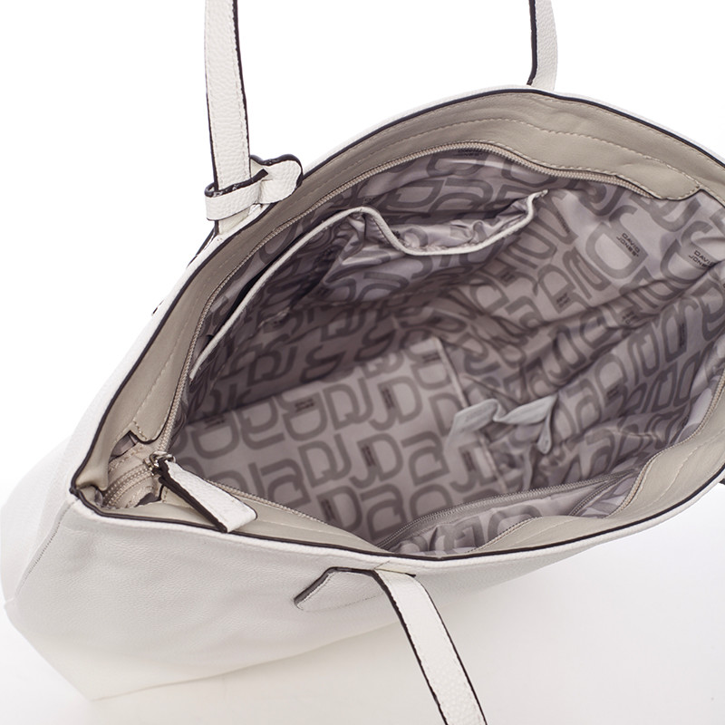Ponúkame vám elegantnú väčšiu priestrannú kabelku David Jones z jarno letnej kolekcie 2016 v bielej farbe. Kabelka sa vyznačuje jemnou eleganciou, veľkým priestorom a kvalitným spracovaním. Vnútri vám kabelka ponúkne menšie vrecká bez zipsu a so zipsom. Podšívka je sivá s logami DJ. Kabelku môžete nosiť cez rameno alebo v ruke. Novinka leto 2016!