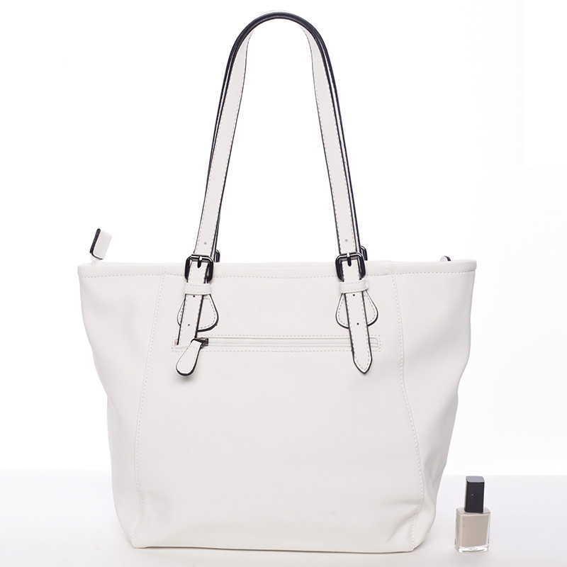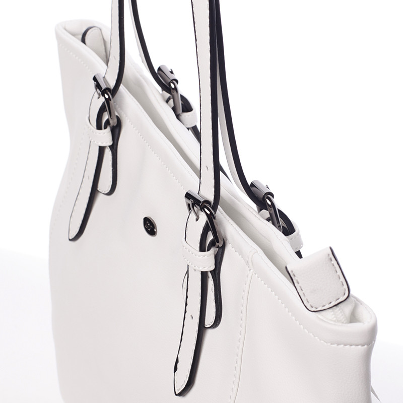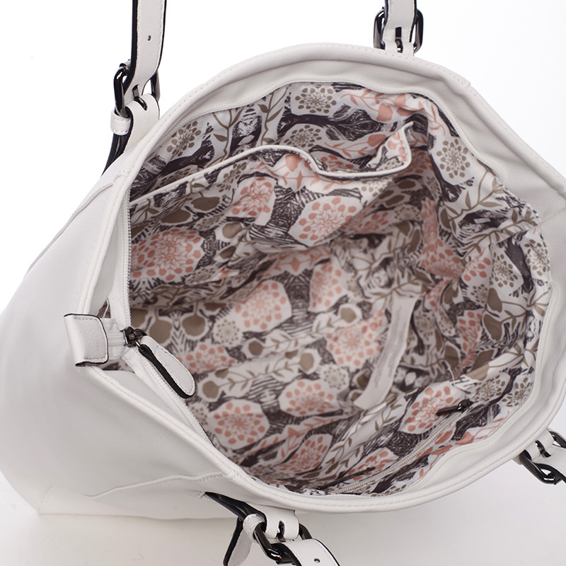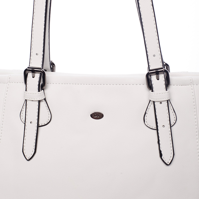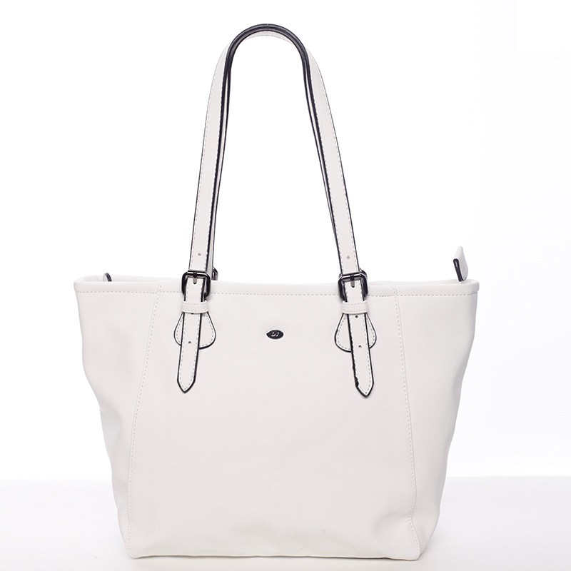 Ponúkame vám elegantnú väčšiu kabelku David Jones z jarno letnej kolekcie 2016 v bielej farbe. Kabelka sa vyznačuje jemnou eleganciou, veľkým priestorom, kvalitným spracovaním a možnosťou nastaviť ucha. Vnútri vám kabelka ponúkne menšie vrecká bez zipsu a so zipsom. Podšívka je sivá s logami DJ. Kabelku môžete nosiť cez rameno alebo v ruke. Novinka leto 2016!