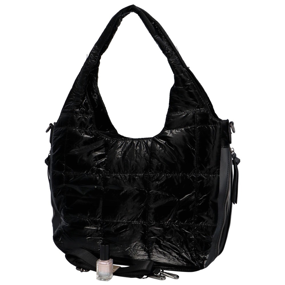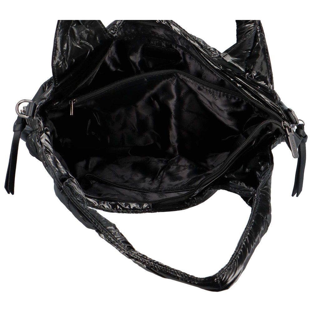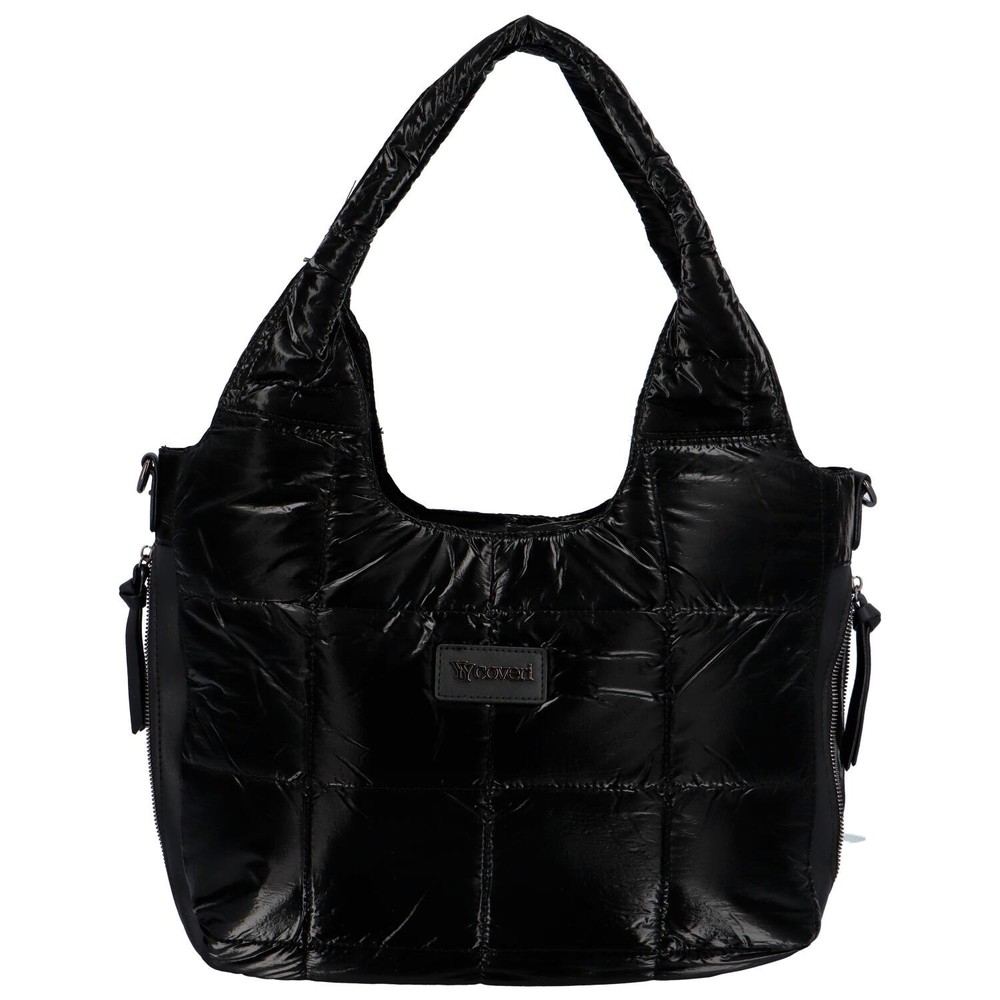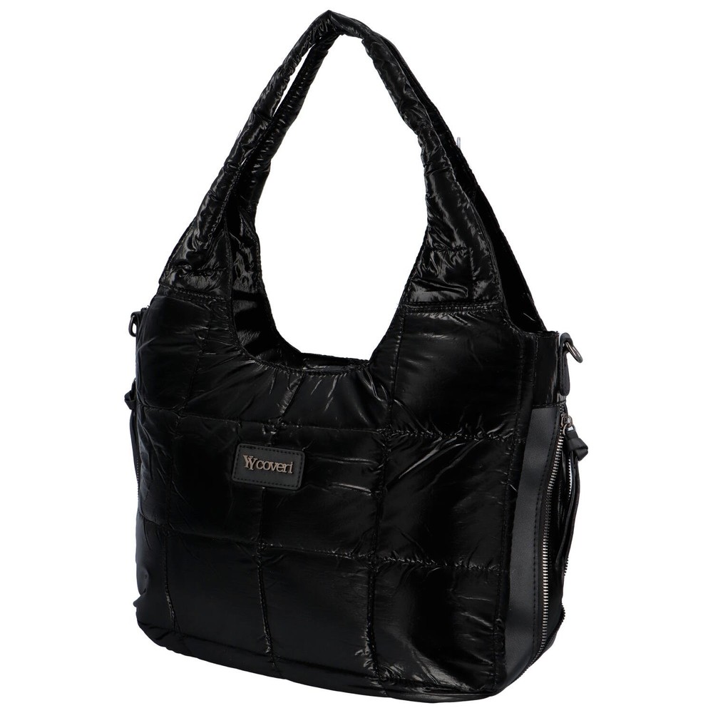 Unikátne syntetické kabelky od značky Coveri World . Čierna kabelka s odleskom, ktorú môžete nosiť v ruke aj cez rameno, či s popruhom. Originálna väčšia kabelka do mesta. Módny, hladký, lesklý kúsok, ktorý je možné na bokoch, vďaka zipsom, zúžiť či rozšíriť. Hlavné vrecko sa otvára zipsom, vnútorný priestor sa rozdeľuje látkovou prepážkou vo forme vrecka na zips. Chýbať Vám nebudú ani kapsičky na drobnosti.