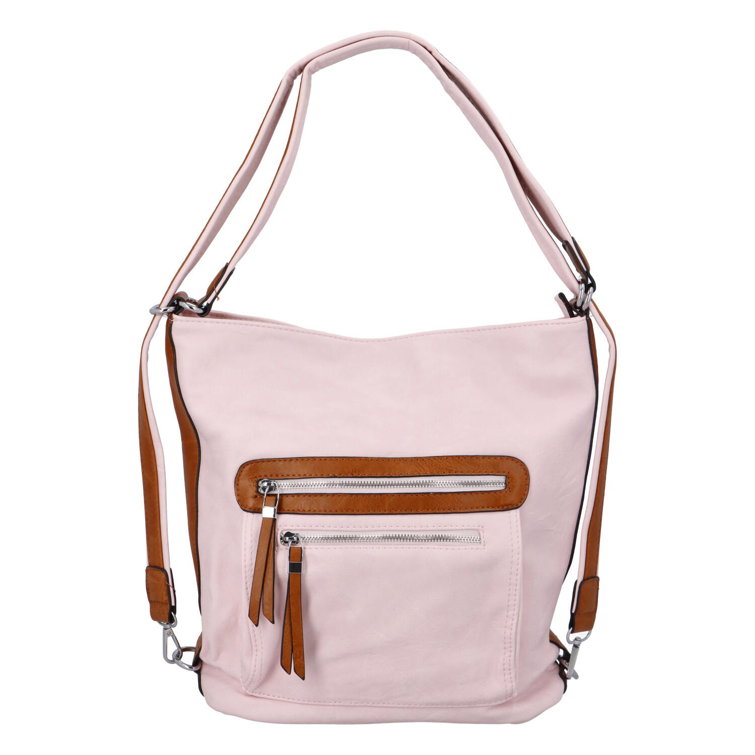 Ďalší z modelov kabelko-batohov od ROMINA & CO. BAGS je svetlo ružová módna kabelka Jaylyn. Vďaka svojej veľkosti Vám môže slúžiť pri ceste do práce, do školy, za zábavou alebo na nákupy. Budete vyzerať trendy a pritom môžete mať so sebou veľké množstvo vecí, ktoré každá žena potrebuje. Je mäkká s pevnejším oválnym dnom. Kabelka má priestranné hlavné vrecko rozdelené vreckom na zips. Na prednej strane sú dve vrecká na zips, kam môžete uložiť najnutnejšie veci po ruke a aj na zadnej strane je vrecko na drobnosti. Kapsičky všité v hlavnom vrecku Vám tiež prídu vhod. Detaily kabelky sú v hnedej farbe. Objednajte ešte dnes a vyskúšajte, vrátiť ju môžete až za 30 dní!