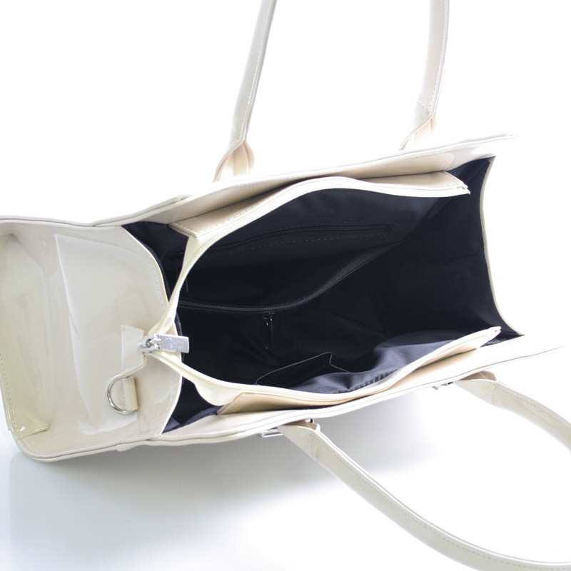 Ponúkame vám luxusnú kabelku Maggio z letnej kolekcie 2016 v béžovej lakovanej farbe. Vnútri vám kabelka ponúkne menšie vrecká bez zipsu a so zipsom a delený priestor vreckom na zips. Kabelka je pevná, strednej veľkosti a môžete ju nosiť v ruke alebo na predlaktí. Súčasťou je odnímateľný nastaviteľný popruh. Novinka leto 2016!