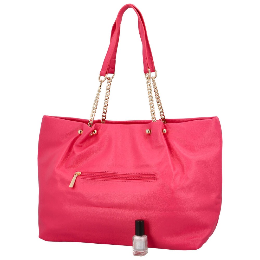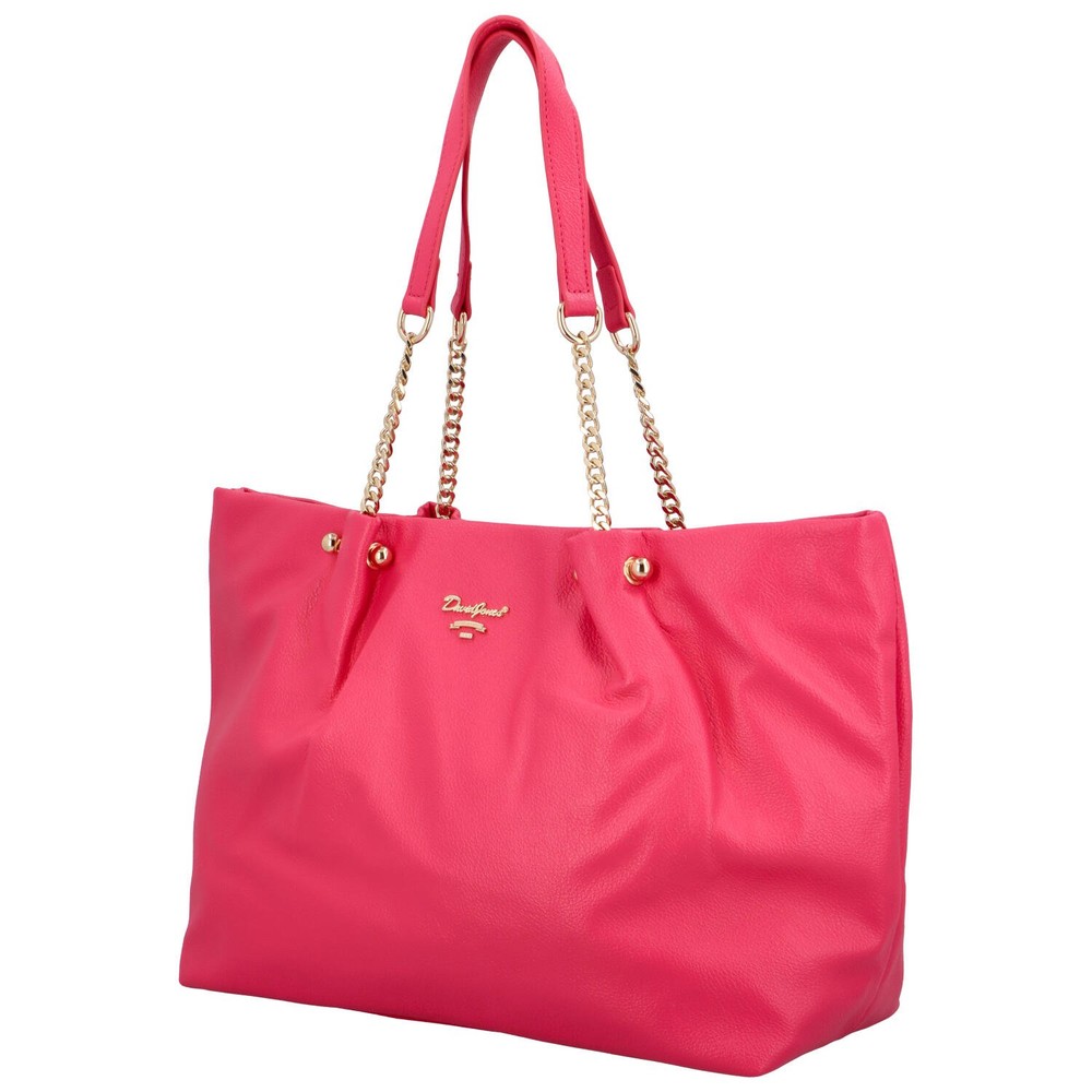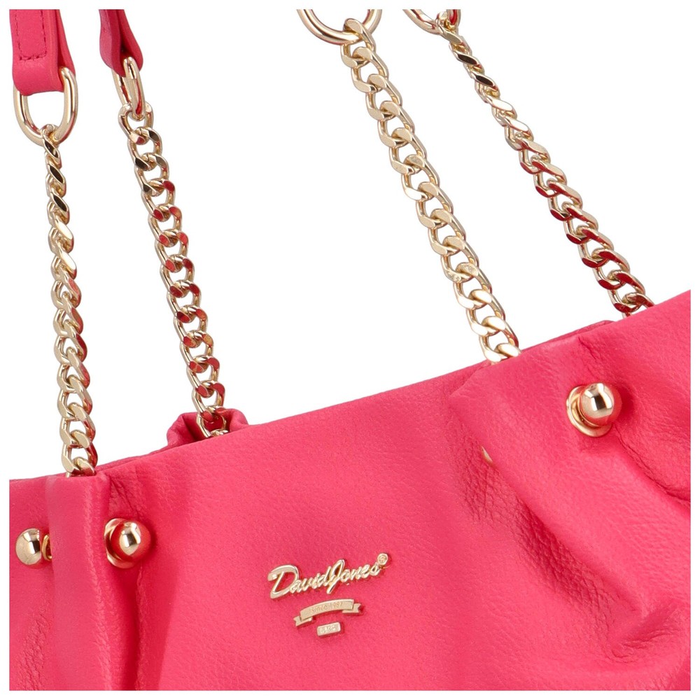 Veľká módna dámska kabelka od značky David Jones. Priestor vám pri tejto fuchsiovej mäkkej kráske rozhodne chýbať nebude. Doplní váš outfit v meste, na nákupoch, ale aj v práci. Nosiť ju možno cez plece za dlhé uši, ktoré sú čiastočne zo syntetiky a čiastočne z kovových krúžkov. Neváhajte a objednajte si úžasnú kabelku! Vrátiť ju môžete až za 30 dní! Hlavné vrecko sa otvára zipsom, priestor kabelky je naozaj veľký a chýbať vám tu nebudú ani klasické voľné vrecká aj vrecko so zipsom.