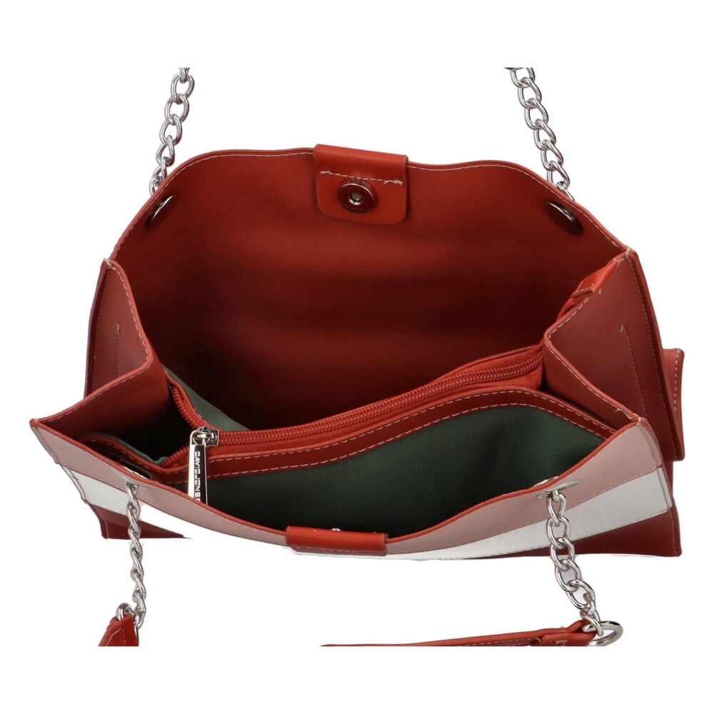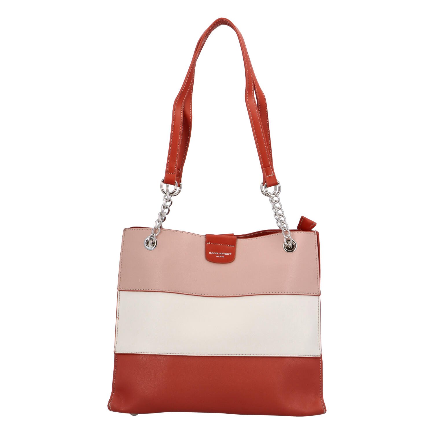 Módna kabelka značky David Jones skvele doplní váš každodenný outfit. Tentokrát v tehlovo červenej, bielej a ružovej farbe. Objednajte ešte dnes a vyskúšajte! Vrátiť ju môžete až za 30 dní! Kabelku je možné nosiť klasicky cez plece, uši kabelky sú sčasti z kovových článkov. Predná strana má vkusne prešívané pruhy. Hlavné vrecko odopnete pomocou magnetického cvočku. Vnútri je veľký priestor a organizér na zips. Vnútri organizéra nájdete dve kapsičky na drobnosti a cennosti. Spodná strana kabelky je prešívaná a disponuje kovovými cvočkami.
