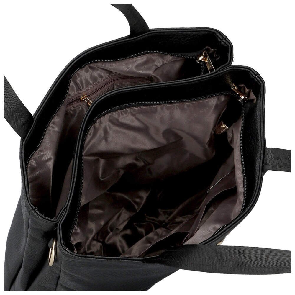 Priestranná dámska kabelka na rameno z kvalitnej koženky je skvelou voľbou pre ženy, ktoré hľadajú štýlový doplnok s dostatkom miesta. Prednú stranu zdobí elegantné logo značky a dve výrazné vypuklé vrecká s chlopňou, ktoré dodávajú kabelke moderný a originálny vzhľad. Model ponúka dve samostatné hlavné vrecká so zapínaním na zips, vďaka ktorým budete mať svoje veci prehľadne usporiadané. Vnútri nechýbajú praktické vrecká v podšívke na uloženie drobností. Na zadnej strane je umiestnené zipsové vrecko. Dlhé uši zaisťujú pohodlné nosenie na ramene, zatiaľ čo prídavný nastaviteľný popruh umožní nosenie cez rameno alebo crossbody. Zlaté kovanie elegantne podčiarkuje celkový dizajn tejto kabelky, ktorá sa stane štýlovým a praktickým spoločníkom na každý deň. Objednajte ešte dnes a vyskúšajte, vrátiť ju môžete do 30 dní!