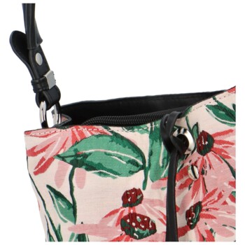 Každá kabelka od značky David Jones má svoje „wow“. Nadchne Vás tentoraz táto dámska kvetinová kabelka cez rameno? Menšia až stredná čierno ružová kabelka zo syntetiky a textilu dodá Vášmu outfitu trendy efekt. Farebné prevedenie umožní skombinovať pestré sukne, blúzky i nohavice. Nosiť ju môžete za ucho alebo aj s popruhom. Je mäkká s pevnejším dnom. Predná strana je obohatená o dvojitý ľúbivý remienok s kovovými sponami. Nechýba tu logo značky. Kabelka ponúkne tri vrecká. Dve s magnetom a prostredné na zips. To obsahuje klasické vrecká na telefón a cennosti. Objednajte ešte dnes a vyskúšajte! Vrátiť ju môžete až za 30 dní!