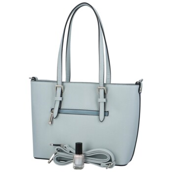 Objednajte ešte dnes a vyskúšajte, vrátiť ju môžete až za 30 dní! Krásne kabelky s elegantným vzhľadom - to je FLORA&CO . Svetlomodrá kabelka cez rameno je stredne veľká a má vzor saffiano. Jedná sa o pevný model s pevným dnom a kovovými cvokmi na spodnej strane. Otvára sa zipsom, vnútorný priestor sa delí na dve hlavné úložiská a to prostredníctvom vrecka so zipsom. Na prednej strane je bonusom kovový článok, ku ktorému je možné pripnúť akýkoľvek prívesok .