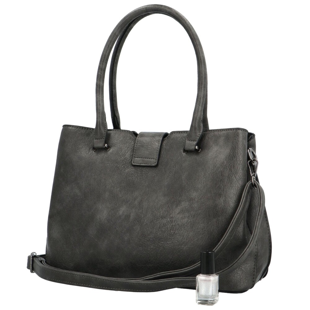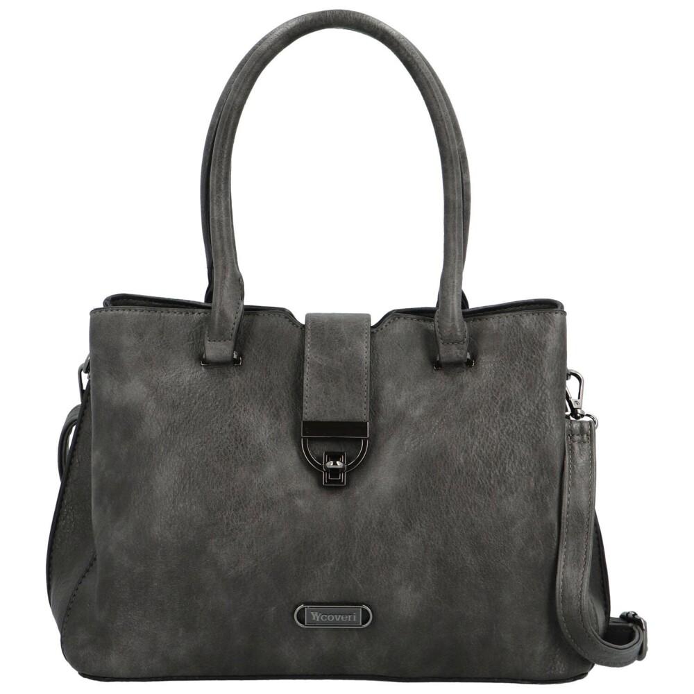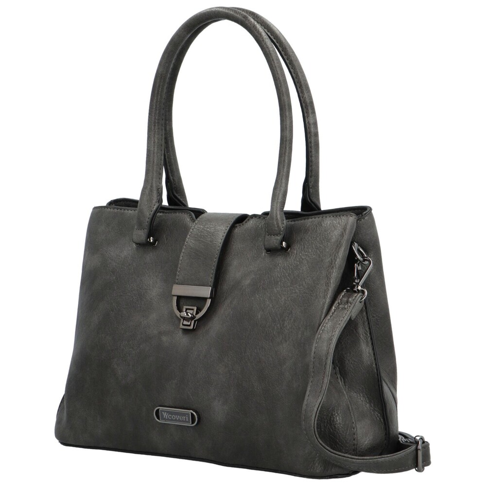 Príjemná sivá dámska koženková taška od Coveri, pre váš krásny deň. Zdobí ju malá chlopňa s kovovou prackou na zámok a logo značky. Hlavné vrecko sa otvára zipsom a vo vnútri je priestor rozdelený prepážkou, nechýbajú postranné vrecká na drobnosti. Môžete si tak všetko krásne rozdeliť. Uši sú dostatočne dlhé na nosenie cez ramene, ale aj v ruke. Ku kabelke patrí aj dlhý popruh na pripnutie. Objednajte ešte dnes a vyskúšajte! Vrátiť ju môžete až do 30 dní!