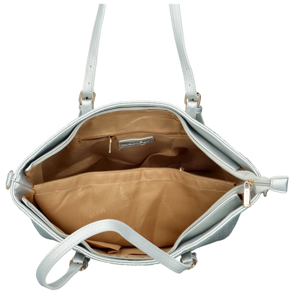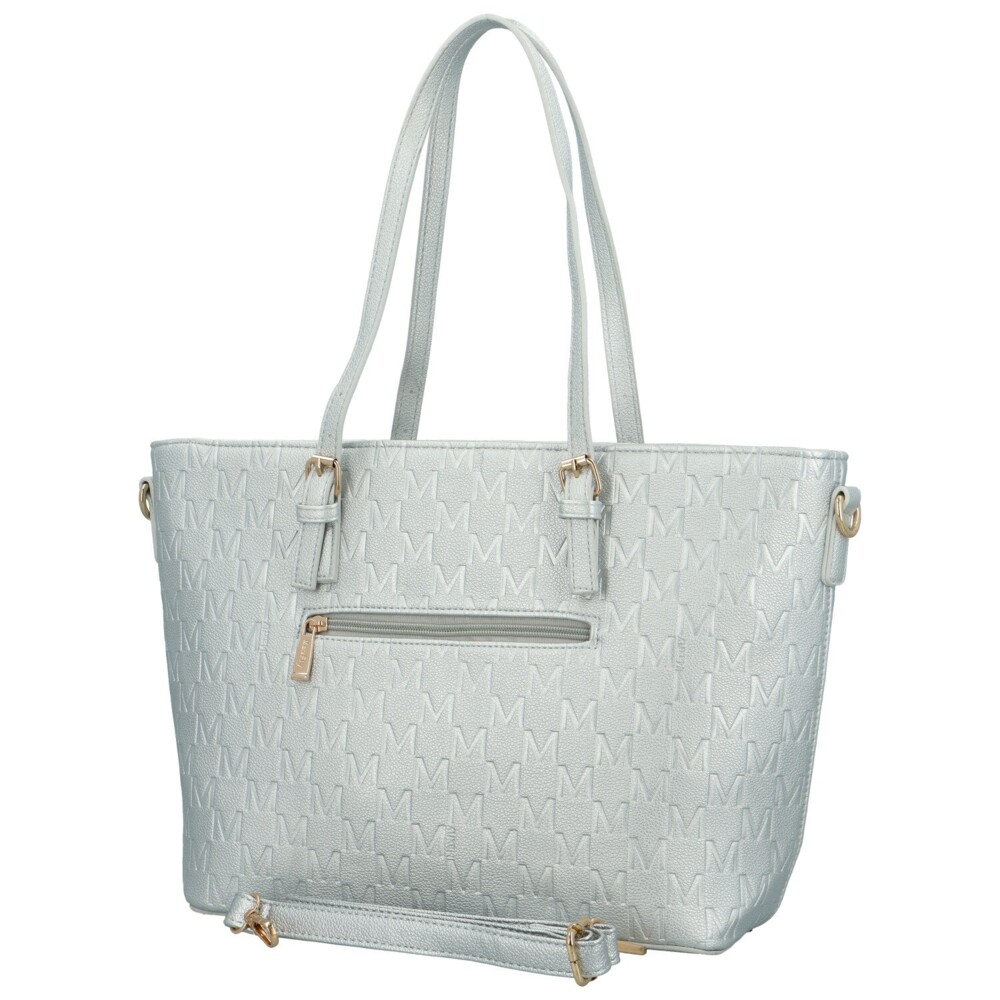 Táto strieborná trendy kabelka od MaxFly je praktický a štýlový doplnok vhodný na každodenné nosenie. Tvar je obdĺžnikový s ľahko zaoblenými rohmi. Je vyrobená z odolnej koženky, v ktorej je vyrazené opakujúce sa písmeno "M", ktoré dodáva kabelke luxusný výrazný vzhľad. Hlavná kapsa je na zips a vo vnútri má stredové zipsové vrecko, ktoré priestor delí a spoločne s menšími kapsičkami poslúži na organizáciu vašich vecí. Zadná strana ponúka vrecko na zips. Kabelka je vybavená dvoma pevnými ušami, na nosenie cez rameno, ale aj dlhým prídavným popruhom pre väčšie pohodlie pri nosení. Kovanie je v zlatej farbe a umocňuje luxusný dojem z kabelky. Objednajte ešte dnes a vyskúšajte! Vrátiť ju môžete až do 30 dní!