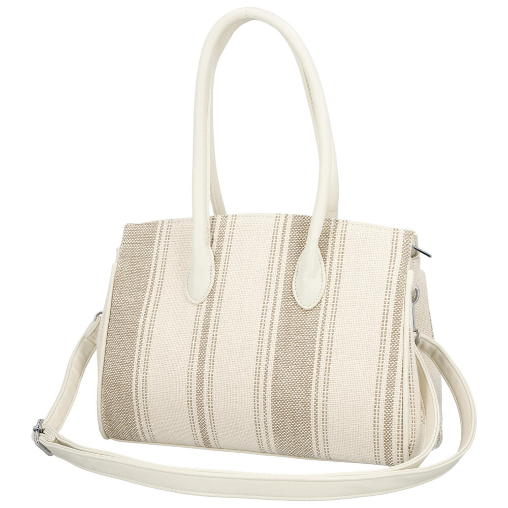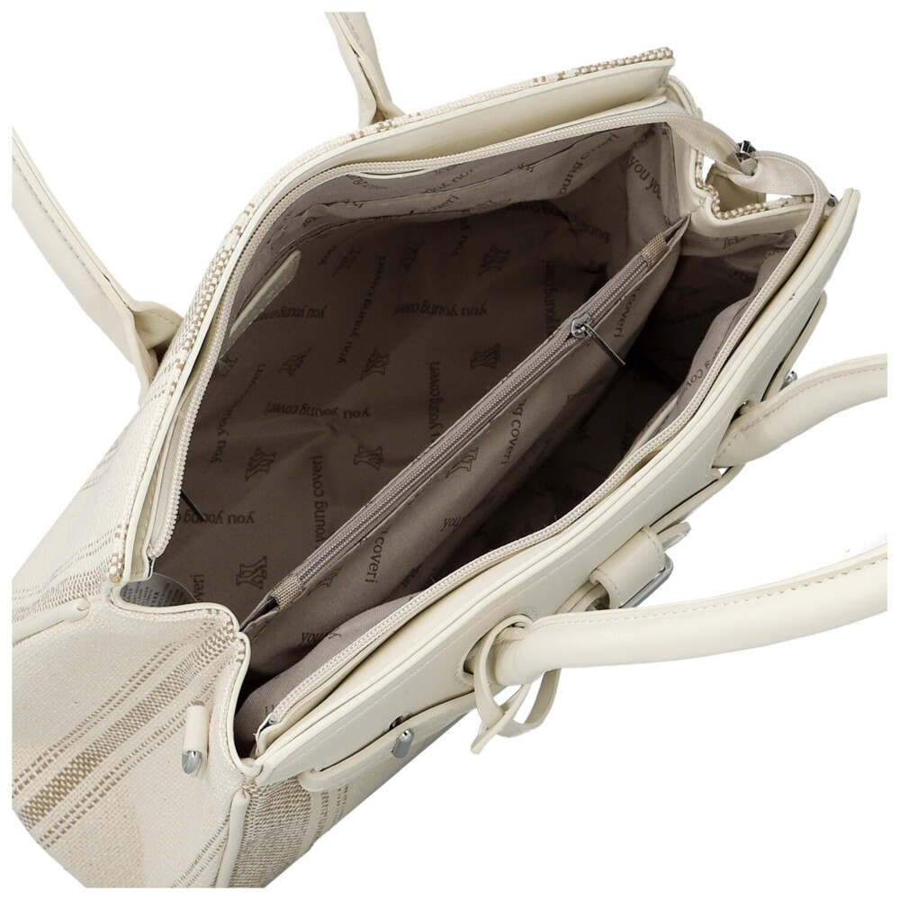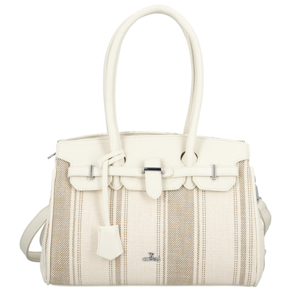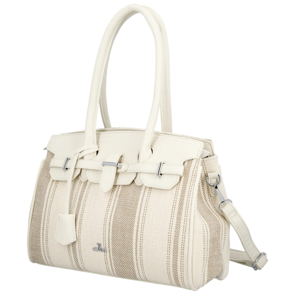 Elegantná dámska kabelka, od značky Coveri, v jemnom svetlo béžovom prevedení kombinuje moderný dizajn s mestskou inšpiráciou, čo si všimnete hneď na prednej strane. Vzor textilu s decentným prúžkom dodáva syntetickej kabelke svieži a ľahký vzhľad, ideálny pre jarnú a letnú sezónu. Pevnejšie zaguľatené uši umožňujú pohodlné nosenie na predlaktí, zatiaľ čo odnímateľný a nastaviteľný popruh ponúka možnosť nosenia cez rameno. Kabelka disponuje dostatočne priestranným interiérom pre každodenné potreby, dva priestory oddelené vreckom na zips, a vďaka hlavnému zapínaniu na zips zostanú vaše veci bezpečne uložené. Štýlové detaily, ako sú kovové prvky a ozdobný opasok, podčiarkujú elegantný charakter tohto modelu. Perfektná voľba pre ženy, ktoré hľadajú spojenie praktickosti a nadčasového štýlu. Celkovo je kabelka pevnejšia, dobre drží tvar a bonusom je prívesok na uchu kabelky. Tak objednajte ešte dnes a vyskúšajte, vrátiť ju môžete do 30 dní.