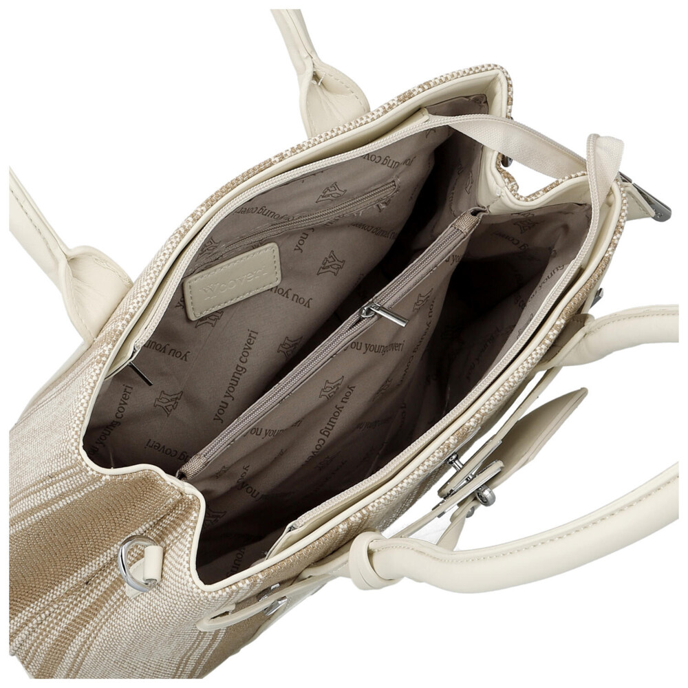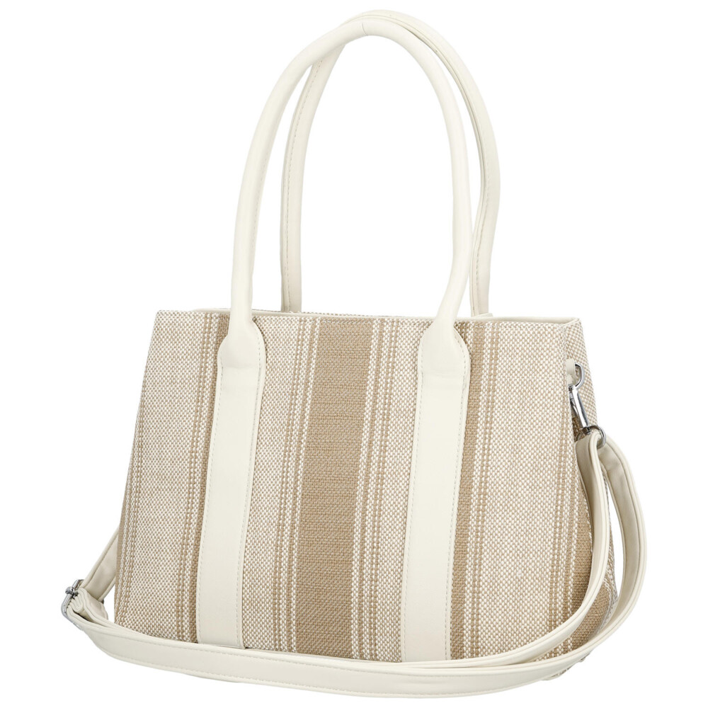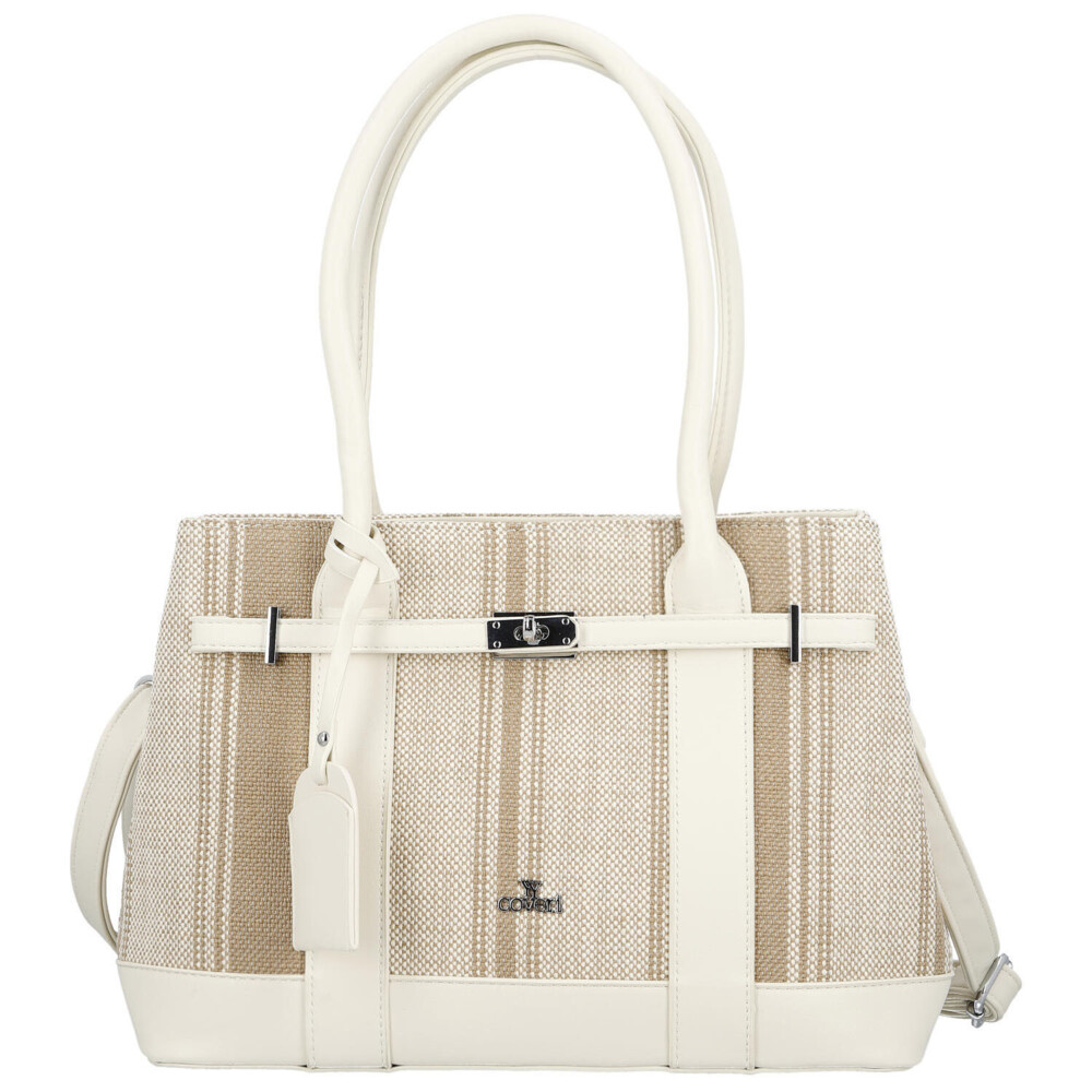 Elegantná dámska kabelka, od značky Coveri, v jemnom tmavo béžovom prevedení kombinuje moderný dizajn s mestskou inšpiráciou, čo si všimnete hneď na prednej strane. Vzor textilu s decentným prúžkom dodáva syntetickej kabelke svieži a ľahký vzhľad, ideálny pre jarnú a letnú sezónu. Pevnejšie zaguľatené uši umožňujú pohodlné nosenie na predlaktí, zatiaľ čo odnímateľný a nastaviteľný popruh ponúka možnosť nosenia cez rameno. Kabelka disponuje dostatočne priestranným interiérom pre každodenné potreby, dva priestory oddelené vreckom na zips, a vďaka hlavnému zapínaniu na zips zostanú vaše veci bezpečne uložené. Štýlové detaily, ako sú kovové prvky a ozdobný opasok, podčiarkujú elegantný charakter tohto modelu. Perfektná voľba pre ženy, ktoré hľadajú spojenie praktickosti a nadčasového štýlu. Celkovo je kabelka pevnejšia, dobre drží tvar a bonusom je prívesok na uchu kabelky. Tak objednajte ešte dnes a vyskúšajte, vrátiť ju môžete do 30 dní.