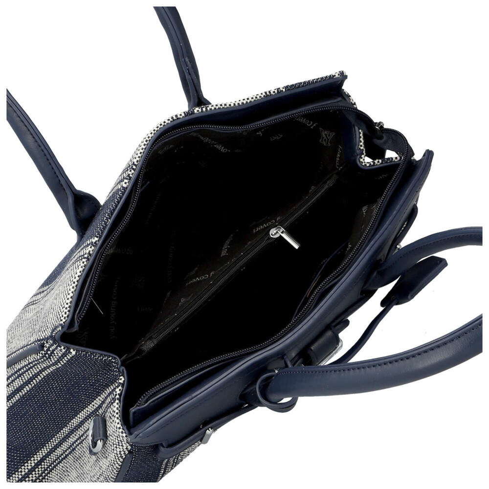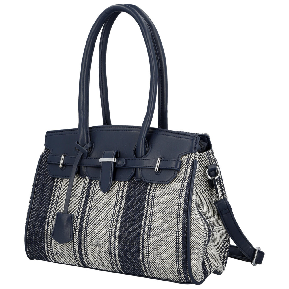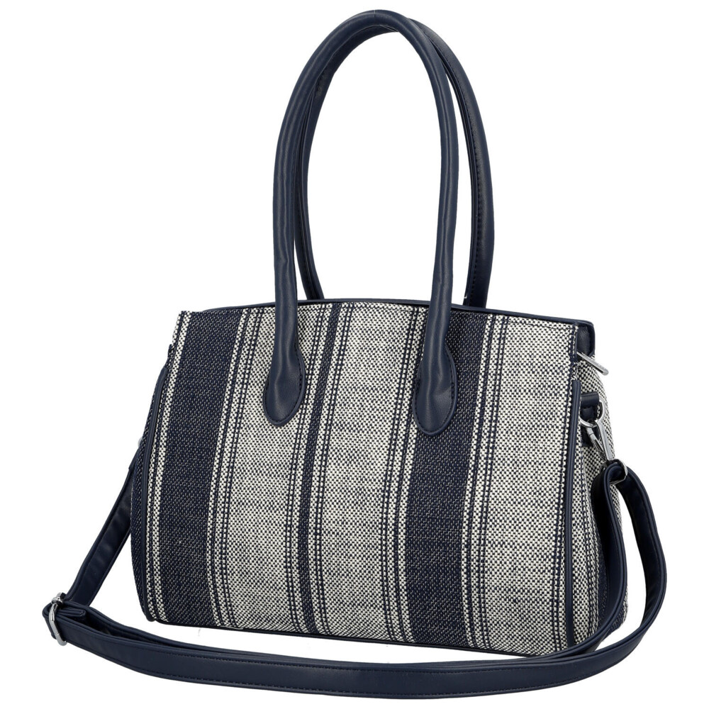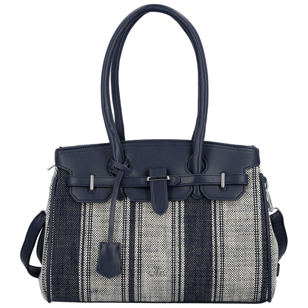 Elegantná dámska kabelka, od značky Coveri, v jemnom tmavo modrom prevedení kombinuje moderný dizajn s mestskou inšpiráciou, čo si všimnete hneď na prednej strane. Vzor textilu s decentným prúžkom dodáva syntetickej kabelke svieži a ľahký vzhľad, ideálny pre jarnú a letnú sezónu. Pevnejšie zaguľatené uši umožňujú pohodlné nosenie na predlaktí, zatiaľ čo odnímateľný a nastaviteľný popruh ponúka možnosť nosenia cez rameno. Kabelka disponuje dostatočne priestranným interiérom pre každodenné potreby, dva priestory oddelené vreckom na zips, a vďaka hlavnému zapínaniu na zips zostanú vaše veci bezpečne uložené. Štýlové detaily, ako sú kovové prvky a ozdobný opasok, podčiarkujú elegantný charakter tohto modelu. Perfektná voľba pre ženy, ktoré hľadajú spojenie praktickosti a nadčasového štýlu. Celkovo je kabelka pevnejšia, dobre drží tvar a bonusom je prívesok na uchu kabelky. Tak objednajte ešte dnes a vyskúšajte, vrátiť ju môžete do 30 dní.