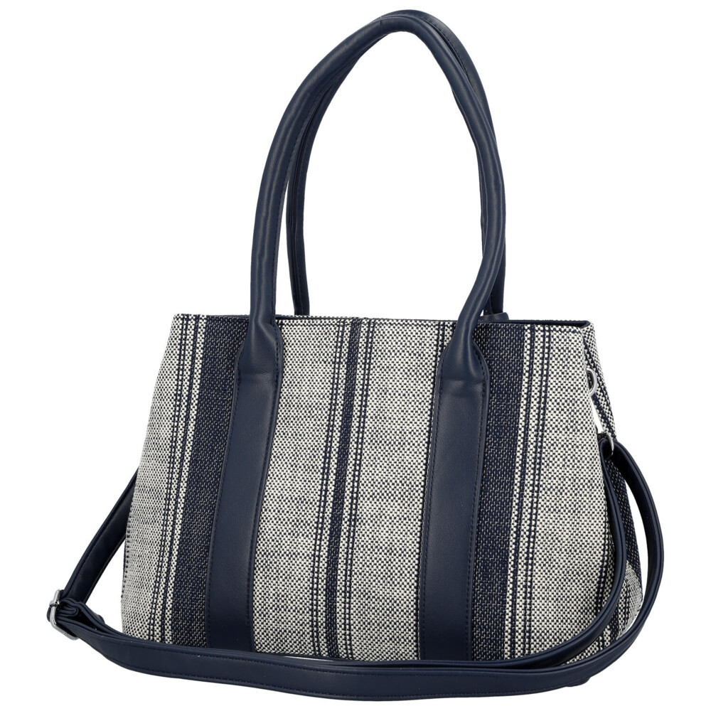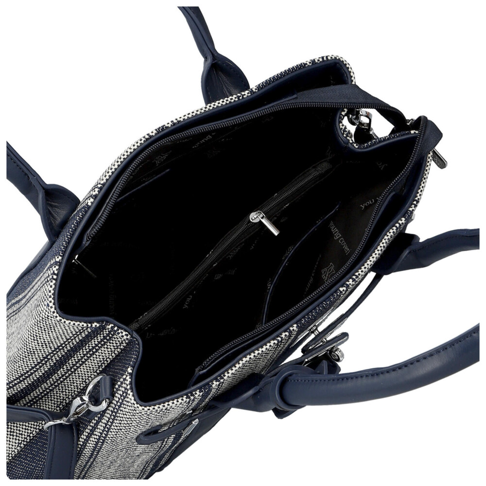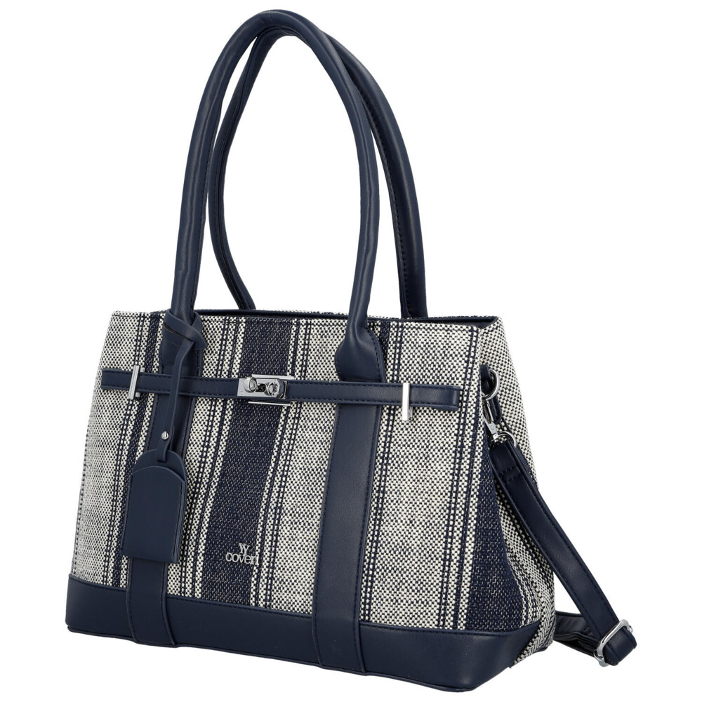 Elegantná dámska kabelka, od značky Coveri, v jemnom tmavo modrom prevedení kombinuje moderný dizajn s mestskou inšpiráciou, čo si všimnete hneď na prednej strane. Vzor textilu s decentným prúžkom dodáva syntetickej kabelke svieži a ľahký vzhľad, ideálny pre jarnú a letnú sezónu. Pevnejšie zaguľatené uši umožňujú pohodlné nosenie na predlaktí, zatiaľ čo odnímateľný a nastaviteľný popruh ponúka možnosť nosenia cez rameno. Kabelka disponuje dostatočne priestranným interiérom pre každodenné potreby, dva priestory oddelené vreckom na zips, a vďaka hlavnému zapínaniu na zips zostanú vaše veci bezpečne uložené. Štýlové detaily, ako sú kovové prvky a ozdobný opasok, podčiarkujú elegantný charakter tohto modelu. Perfektná voľba pre ženy, ktoré hľadajú spojenie praktickosti a nadčasového štýlu. Celkovo je kabelka pevnejšia, dobre drží tvar a bonusom je prívesok na uchu kabelky. Tak objednajte ešte dnes a vyskúšajte, vrátiť ju môžete do 30 dní.