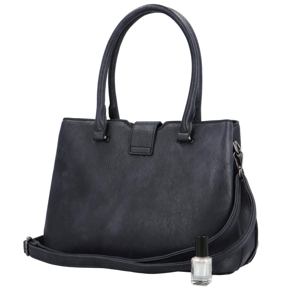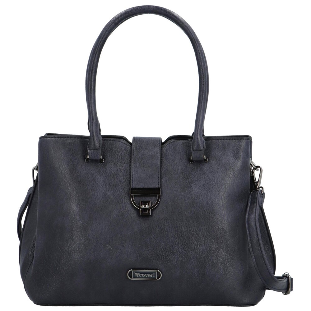 Príjemná tmavomodrá dámska koženková taška od Coveri, pre váš krásny deň. Zdobí ju malá chlopňa s kovovou prackou na zámok a logo značky. Hlavné vrecko sa otvára zipsom a vo vnútri je priestor rozdelený prepážkou, nechýbajú postranné vrecká na drobnosti. Môžete si tak všetko krásne rozdeliť. Uši sú dostatočne dlhé na nosenie cez ramene, ale aj v ruke. Ku kabelke patrí aj dlhý popruh na pripnutie. Objednajte ešte dnes a vyskúšajte! Vrátiť ju môžete až do 30 dní!