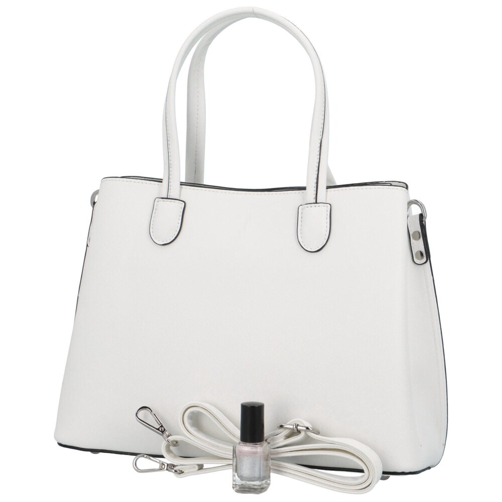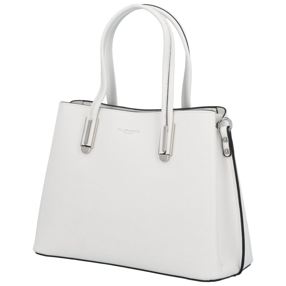 Elegantná biela kabelka do ruky od francúzskej značky FLORA&CO . Kabelka je strednej veľkosti, je pevná a drží tvar. Nosiť ju môžete na predlaktí, v ruke, ale aj cez rameno vďaka odnímateľnému popruhu. Uši kabelky sú pevné a zaguľatené. Kabelka má tri hlavné oddelené vrecká, prostredné sa uzatvára zipsom a má vo vnútri priehradky na drobnosti, ďalšie dve sú na magnetický cvoček. Dno kabelky je chránené kovovými cvočkami proti odreniu. Objednajte ešte dnes a vyskúšajte, vrátiť ho môžete až za 30 dní!