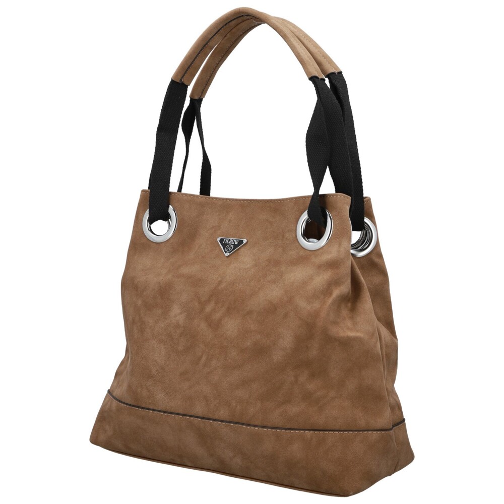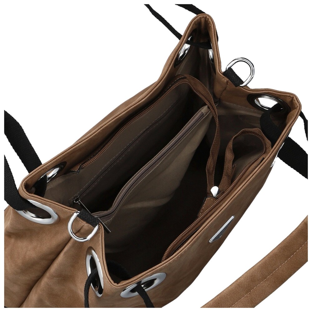 Táto dámska koženková kabelka zaujme na prvý pohľad svojim mäkkým tvarom a elegantne ležérnym vzhľadom. Na prednej strane nechýba decentné kovové logo, ktoré spolu so striebornými očkami vytvára výrazný, ale stále vkusný detail. Široké textilné uši prechádzajú veľkými kovovými prievlakmi, vďaka čomu kabelka krásne padne na rameno a zároveň získava zaujímavý dizajnový prvok. Na zadnej strane je ukryté praktické zipsové vrecko. Hlavné vrecko je zaistené zipsom a vo vnútri vás čaká prehľadné usporiadanie, vrecká v podšívke aj stredová zipsová časť. Pre maximálne pohodlie je tu navyše dlhý textilný popruh na pripnutie, vďaka ktorému môžete kabelku nosiť aj ako crossbody. Strieborné kovanie krásne doladí jej svieži, moderný vzhľad. Objednajte ešte dnes a vyskúšajte, vrátiť ju môžete až do 30 dní!