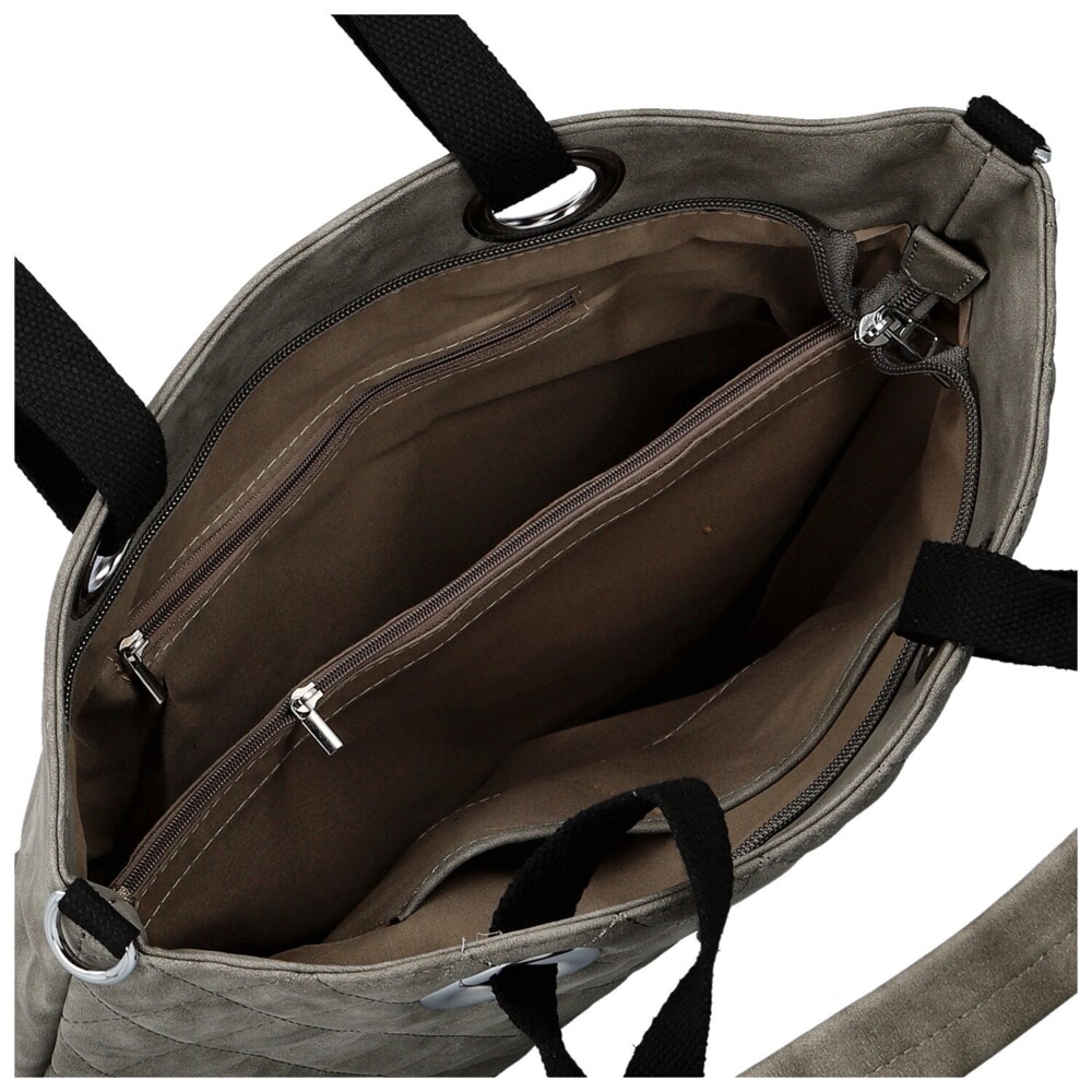 Štýlová a priestranná, táto veľká koženková kabelka na rameno zaujme na prvý pohľad svojim dizajnovým prešitím do tvarov kosoštvorcov. Prednú stranu zdobia logo značky a strieborné kovové krúžky, ktorými sú uchytené kombinované textilné a koženkové uši, dodávajúce kabelke moderný charakter. Hlavné vrecko na zips ponúka dostatok priestoru, vo vnútri nájdete menšie vrecká v podšívke a stredové zipsové vrecko pre lepšiu organizáciu. Zadné zipsové vrecko poskytuje praktický úložný priestor. Textilný popruh na pripnutie a strieborné kovanie dokončujú elegantný a zároveň funkčný design, ktorý sa hodí ku každodenným aj pracovným outfitom. Objednajte ešte dnes a vyskúšajte, vrátiť ju môžete až do 30 dní!