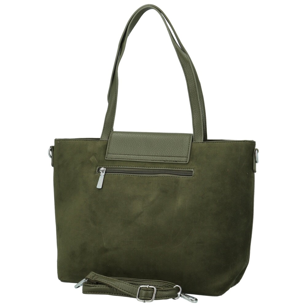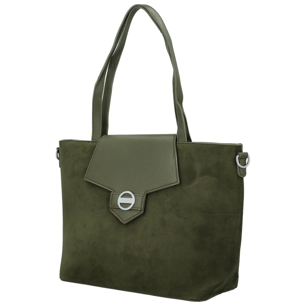 Elegantná dámska kabelka, ktorá spája jemnosť semišového vzhľadu s nadčasovým šarmom hladkej koženky. Telo kabelky pôsobí mäkko a zamatovo, zatiaľ čo výrazný poklop z hladkej koženky s ozdobným kovovým logom dodáva celku moderný a prepracovaný vzhľad. Po jej otvorení sa ukrýva hlavné vrecko na zips, v ktorom nájdete praktické vrecká v podšívke aj stredové zipsové vrecko pre lepšie usporiadanie vecí. Na zadnej strane nechýba samostatné zipsové vrecko pre drobnosti, ktoré chcete mať po ruke. Kabelku môžete nosiť v ruke aj cez rameno vďaka dlhým uchom, alebo ju doplniť o odnímateľný dlhý popruh. Strieborné kovanie krásne ladí s teplým odtieňom materiálu a podčiarkuje jej sofistikovaný štýl. Objednajte ešte dnes a vyskúšajte, vrátiť ju môžete až do 30 dní!