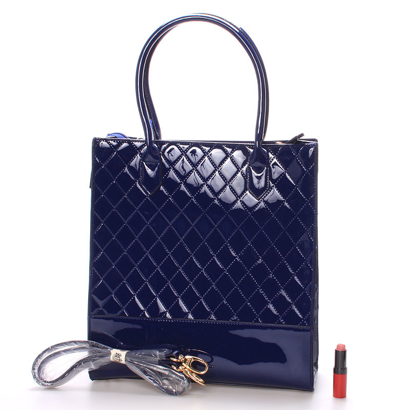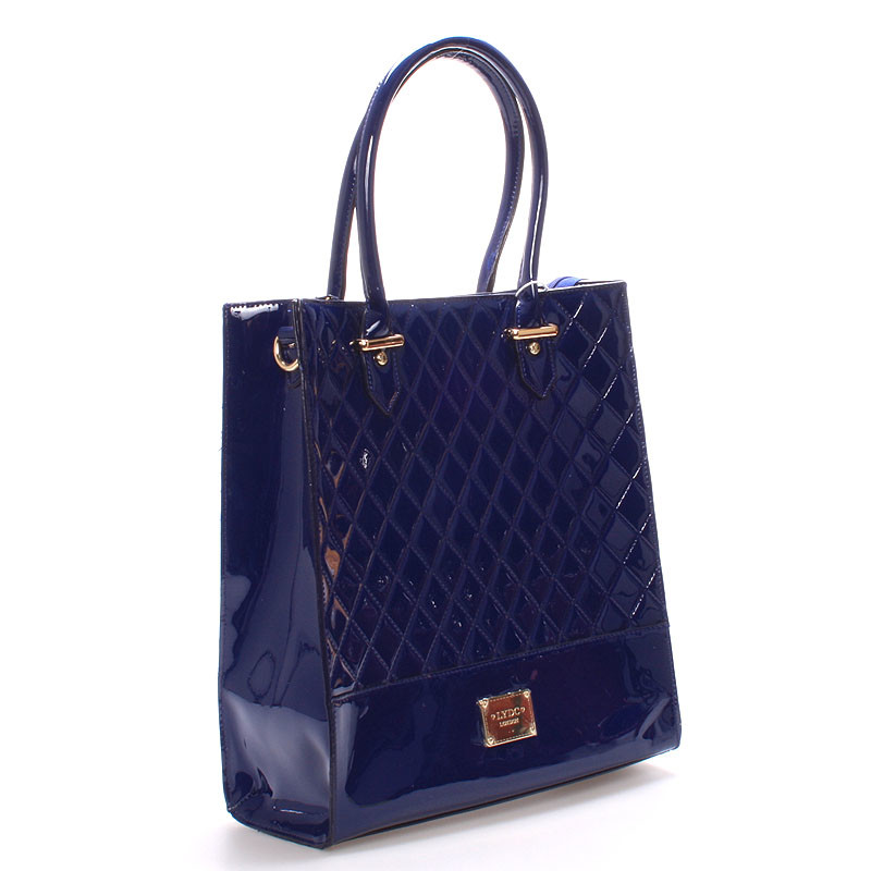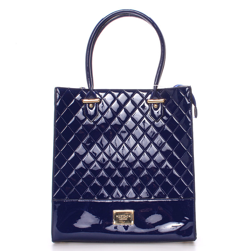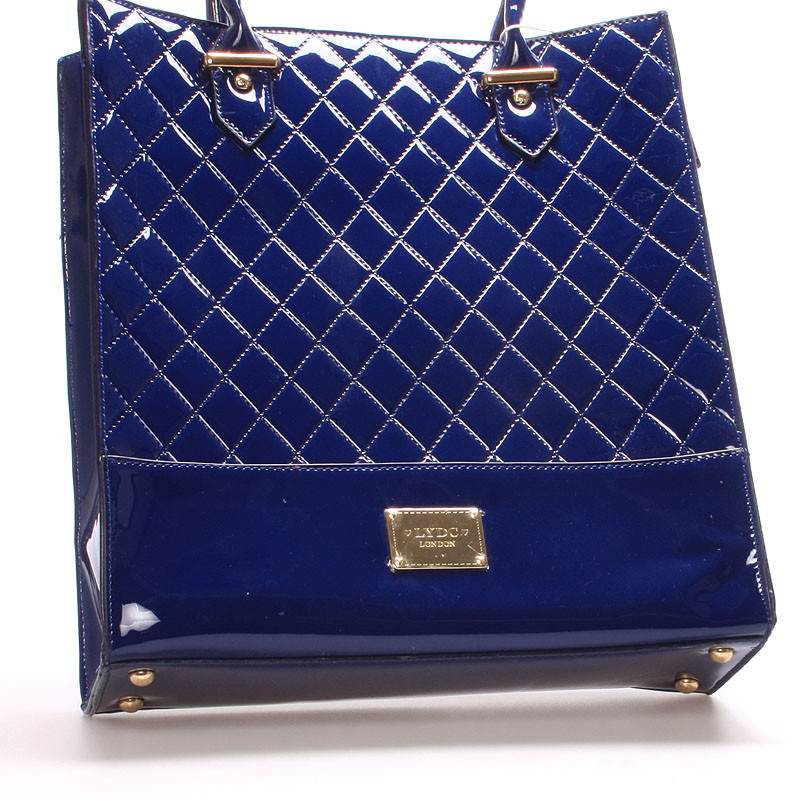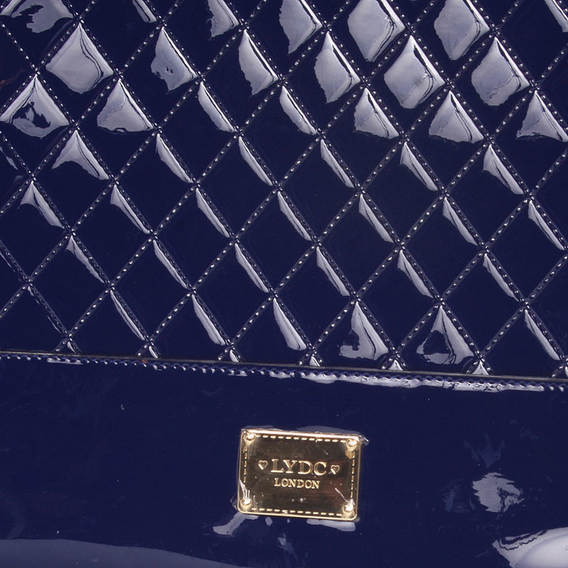 Elegantná modrá kabelka LYDC prešívaná a s lakovaným povrchom. Kabelka je z pevného materiálu a držia svoj tvar. Vnútri je nedelený priestor s kapsičkami a púdrovú podšívkou. Kovové čítať sú v zlatej farbe a s logami LYDC.
