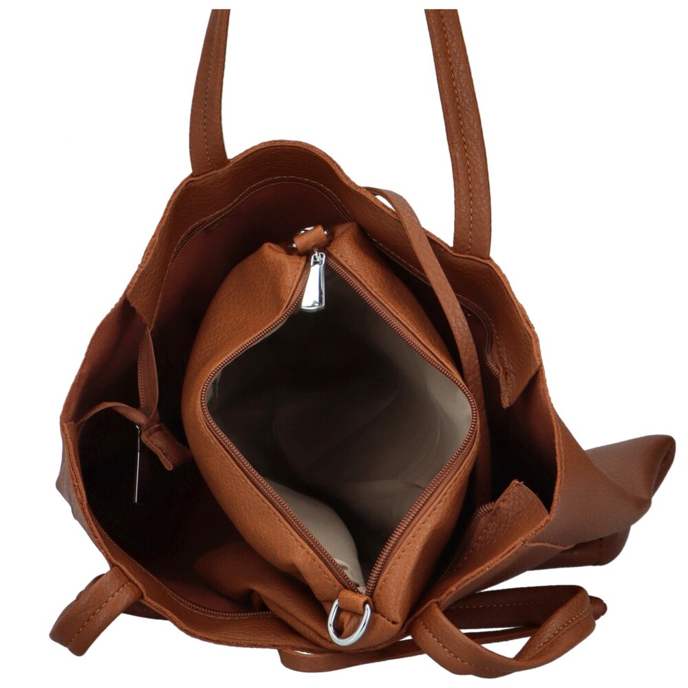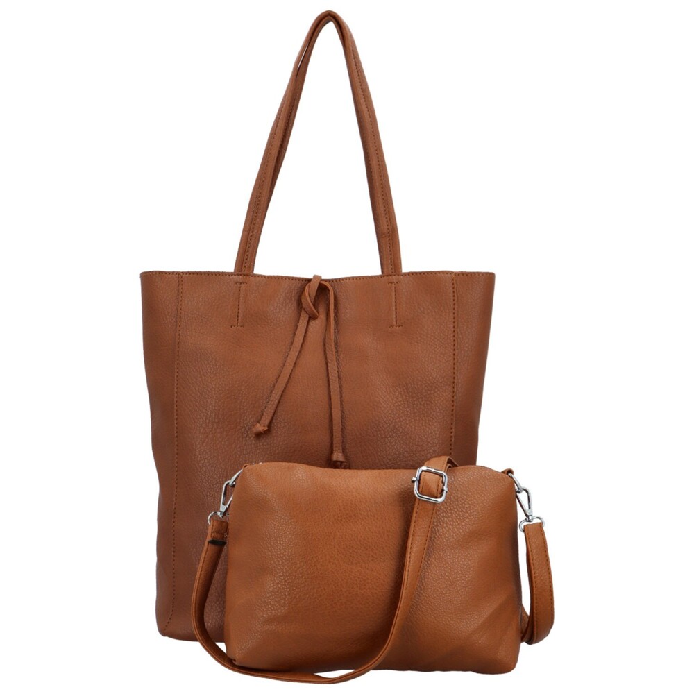 Sada hnedých koženkových kabeliek na každodenné nosenie. Coveri. Väčšia kabelka jednoduchého vzhľadu, ktorý oživuje jemná sťahovacia šnúrka pre lepšie zabezpečenie hlavného vrecka na zips. Menšia kabelka poslúži ako vrecko, alebo ako crossbody po pripnutí dlhého popruhu s možnosťou regulácie. Vďaka jemnej koženke sú tašky veľmi ľahké a príjemné. Môžete ich využiť do mesta, do školy, do práce aj na nákup. Jednoduchý štýl dopĺňa strieborné kovanie. Objednajte ešte dnes a vyskúšajte! Vrátiť ju môžete až do 30 dní!