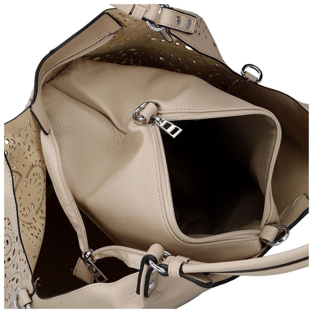 Štýlový set dvoch kabeliek z koženky, ktorý spája moderný dizajn, praktickosť a variabilné nosenie. Väčšia kabelka zaujme originálnou perforovanou prednou stranou, ktorá jej dodáva vzdušný a elegantný vzhľad. Vďaka dvom pevným uchom ju pohodlne znosíte na ramene a strieborné kovanie krásne podčiarkuje jej svieži štýl. Hlavný priestor so zapínaním na zips ponúkne dostatok miesta na všetky každodenné nevyhnutnosti. Vnútri nájdete menšiu samostatnú kabelku, ktorá skvele poslúži ako organizér na prehľadné usporiadanie vecí. Zároveň ju možno nosiť aj samostatne ako trendy crossbody kabelku. Dlhý popruh je odopínací a môžete ho pripnúť ako k menšej, tak aj k väčšej kabelke. Praktický a elegantný set. Objednajte ešte dnes a vyskúšajte, vrátiť ju môžete až do 30 dní!
