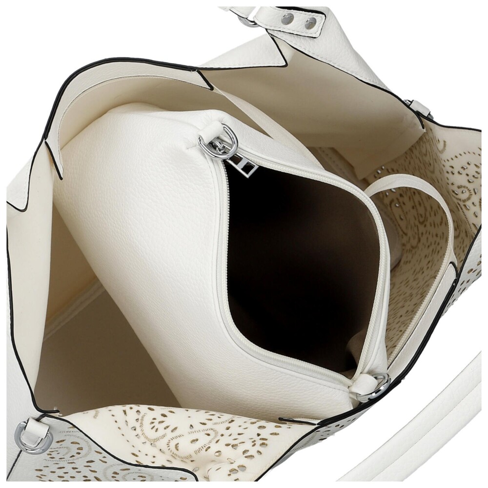Štýlový set dvoch kabeliek z koženky, ktorý spája moderný dizajn, praktickosť a variabilné nosenie. Väčšia kabelka zaujme originálnou perforovanou prednou stranou, ktorá jej dodáva vzdušný a elegantný vzhľad. Vďaka dvom pevným uchom ju pohodlne znosíte na ramene a strieborné kovanie krásne podčiarkuje jej svieži štýl. Hlavný priestor so zapínaním na zips ponúkne dostatok miesta na všetky každodenné nevyhnutnosti. Vnútri nájdete menšiu samostatnú kabelku, ktorá skvele poslúži ako organizér na prehľadné usporiadanie vecí. Zároveň ju možno nosiť aj samostatne ako trendy crossbody kabelku. Dlhý popruh je odopínací a môžete ho pripnúť ako k menšej, tak aj k väčšej kabelke. Praktický a elegantný set. Objednajte ešte dnes a vyskúšajte, vrátiť ju môžete až do 30 dní!