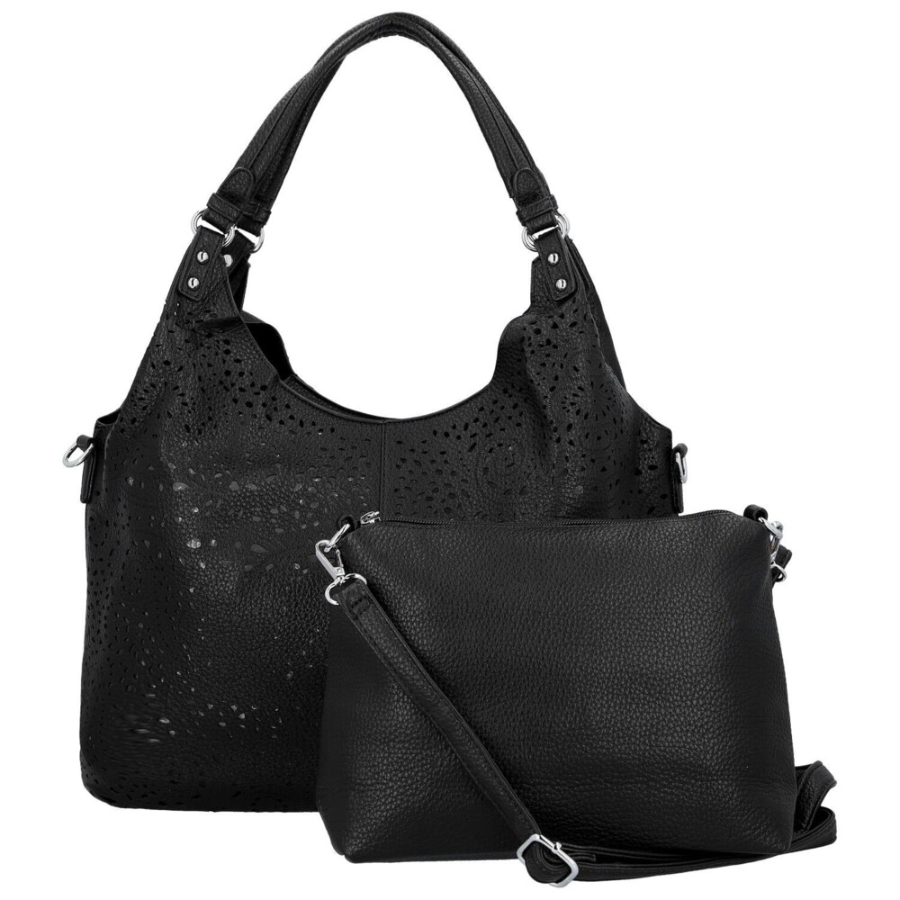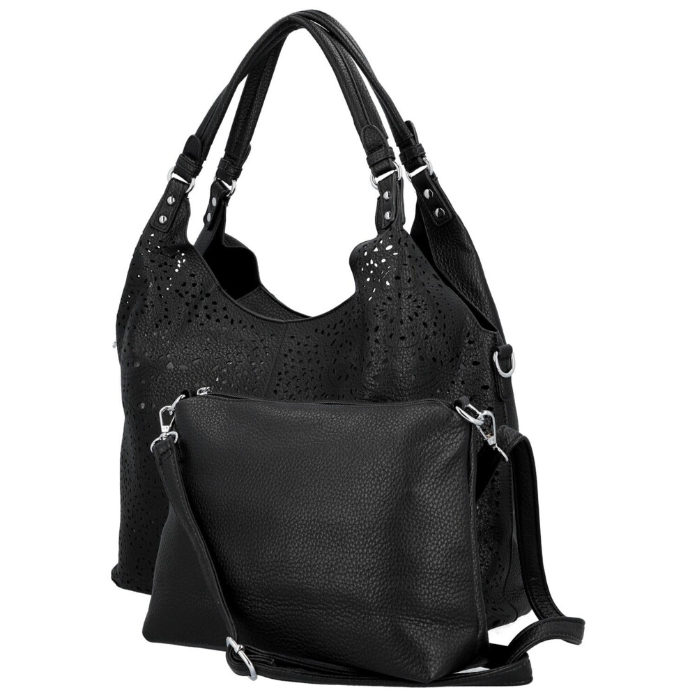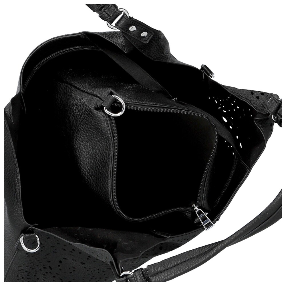 Štýlový set dvoch kabeliek z koženky, ktorý spája moderný dizajn, praktickosť a variabilné nosenie. Väčšia kabelka zaujme originálnou perforovanou prednou stranou, ktorá jej dodáva vzdušný a elegantný vzhľad. Vďaka dvom pevným uchom ju pohodlne znosíte na ramene a strieborné kovanie krásne podčiarkuje jej svieži štýl. Hlavný priestor so zapínaním na zips ponúkne dostatok miesta na všetky každodenné nevyhnutnosti. Vnútri nájdete menšiu samostatnú kabelku, ktorá skvele poslúži ako organizér na prehľadné usporiadanie vecí. Zároveň ju možno nosiť aj samostatne ako trendy crossbody kabelku. Dlhý popruh je odopínací a môžete ho pripnúť ako k menšej, tak aj k väčšej kabelke. Praktický a elegantný set. Objednajte ešte dnes a vyskúšajte, vrátiť ju môžete až do 30 dní!