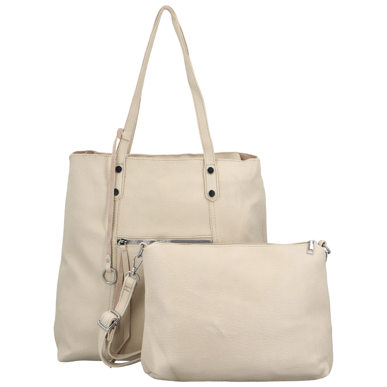 Módna sada koženkové kabelky cez rameno a menšie koženkové kabelky s popruhom na pracovné aj voľné dni. Veľká taška má dlhé uši, ktoré dobre sedia na ramene. Otvára sa zipsom a vo vnútri nájdete menšiu kabelku, ku ktorej môžete pripnúť dlhý, nastaviteľný popruh a nosiť ju ako crossbody alebo si ju nechať vo vnútri a využiť ako kozmetickú taštičku. Prednú stranu veľkej kabelky zdobí menšie zipsové vrecko, pre drobnosti. Strieborné kovanie jemne ladí s celkom. Objednajte ešte dnes a vyskúšajte, vrátiť ju môžete až do 30 dní!