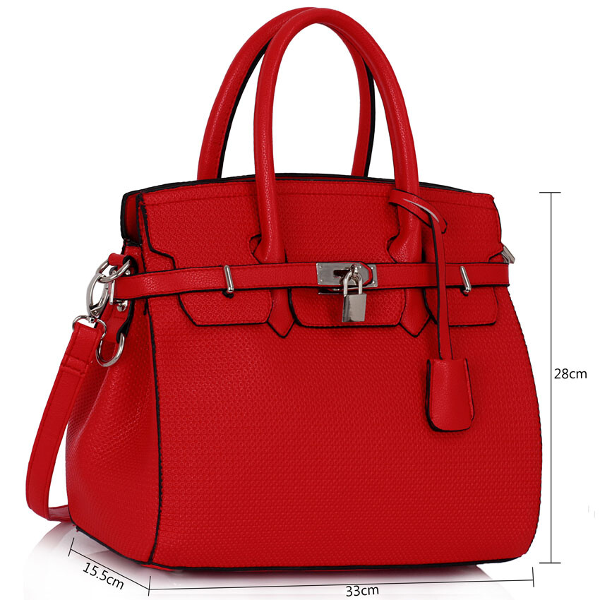 Červená kabelka L & S fashion v štýle Birkin (Hermès), na zámok. Vnútri - vrecko na zips a dve bez zipsu.