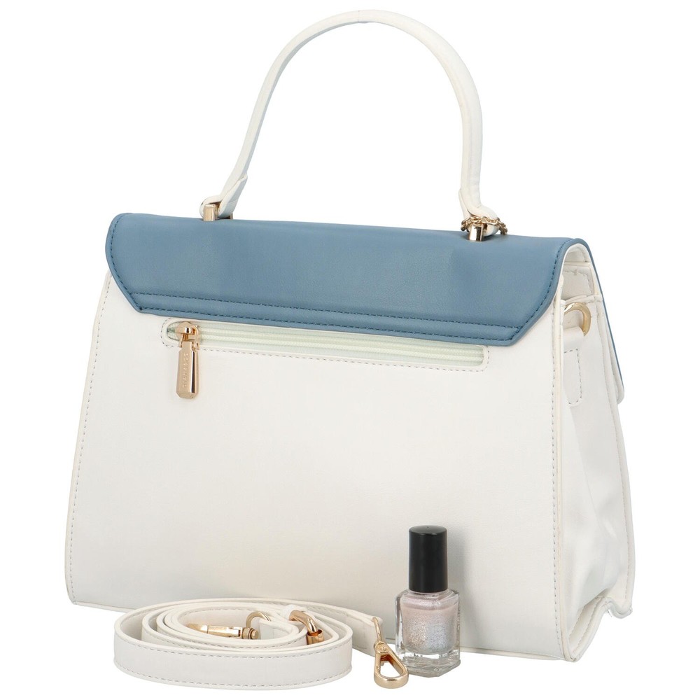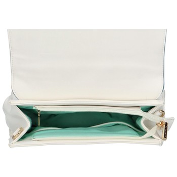 Originálna, stredne veľká, dámska kabelka, ktorú je možné nosiť za ucho v ruke, na predlaktí alebo cez zápästie a vďaka popruhu aj cez plece, od obľúbenej modernej značky DIANA & CO. Objednajte ešte dnes a vyskúšajte! Vrátiť ju môžete až za 30 dní! Dvojfarebnú kabelku môžete nosiť do mesta, na párty aj do spoločnosti. Biela pevná taštička s modrou chlopňou sa otvára magnetom v podobe púdrovej spony s bielym pásikom. Hlavná časť kabelky sa otvára zipsom. Nechýbajú klasické vrecká vo vnútri, ani na zadnej strane kabelky. Celkovo je kabelka pevnejšia s mäkšími bočnými stenami. Bonusom je malý kovový prívesok s logom značky.