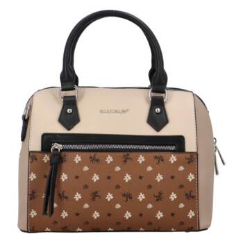 Stredne veľká, elegantná a moderná kabelka do ruky alebo cez plece, od značky David Jones. Objednajte ešte dnes a vyskúšajte! Vrátiť ju môžete až za 30 dní! Tento model má veľmi zaujímavý vzor. Celkovo sa radí medzi pevné typy. Má béžovo hnedú farbu s čiernymi detailmi, pevnejšie uši a spodná strana má kovové cvočky pre lepšiu stabilitu, taktiež zabránia poškodeniu spodnej časti kabelky. Väčšina vreciek na kabelke sa otvára zipsami. Na telefón Vám poslúži voľné vrecko vo vnútri hlavného vrecka.