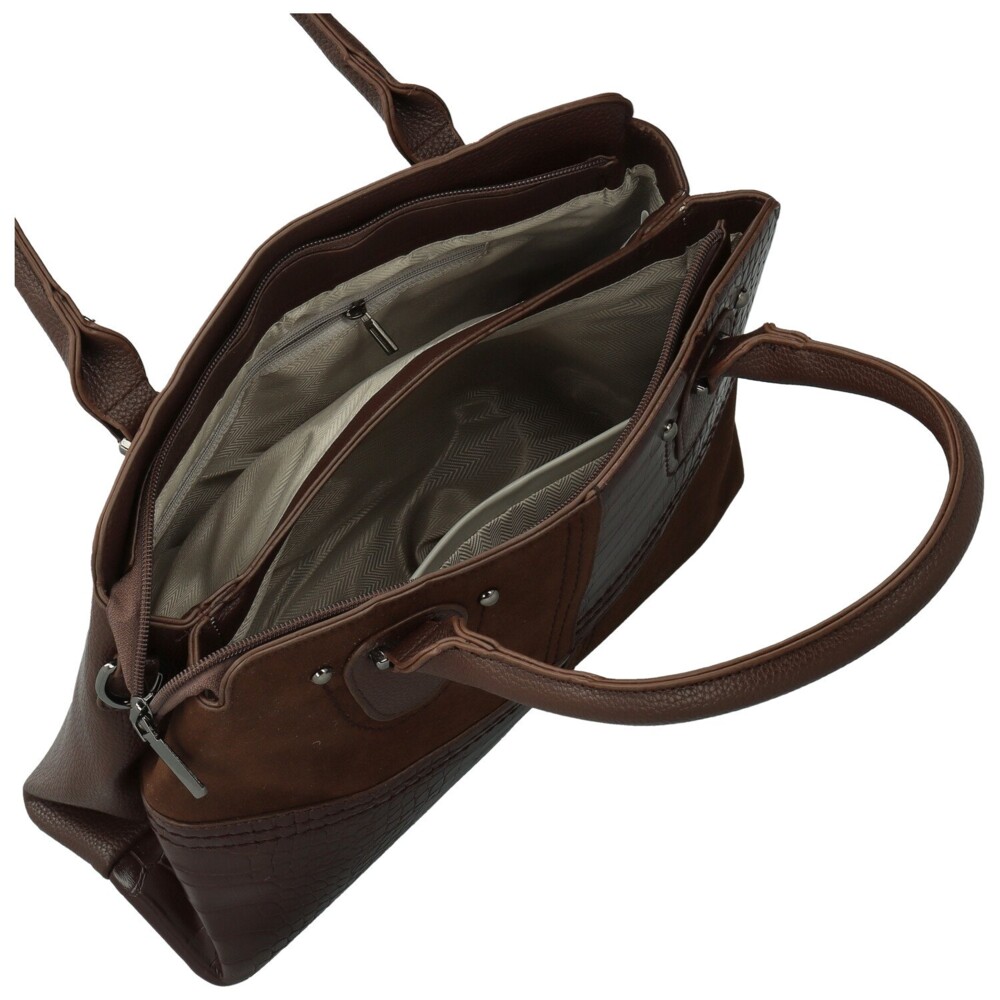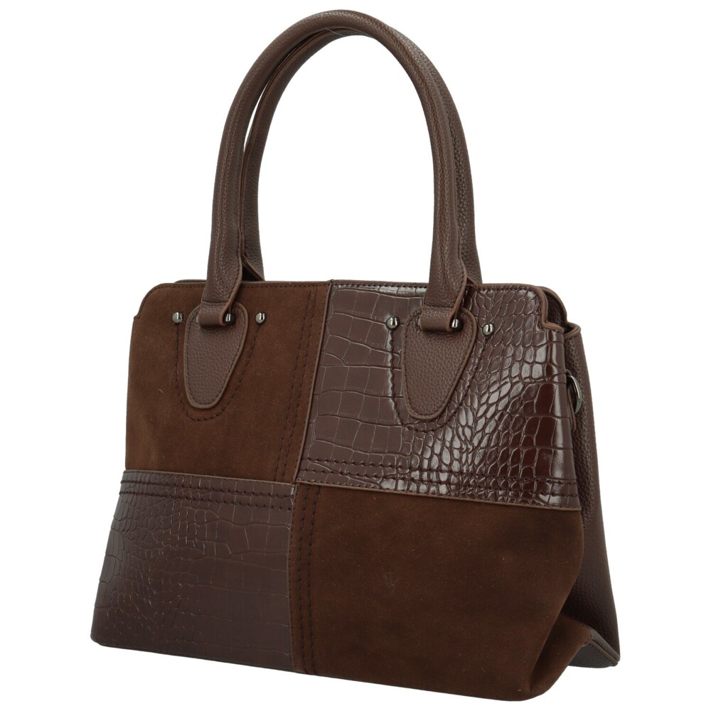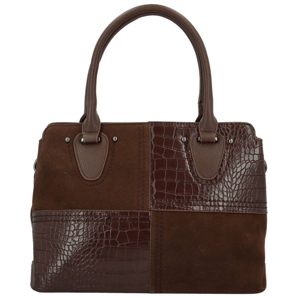 Elegantná koženková kabelka pôsobí moderne a zároveň nadčasovo. Prednú stranu zdobí originálna kombinácia hladkej, semišovo ladenej a štruktúrovanej koženky s krokodílím vzorom, ktoré sú zošité do obdĺžnikových blokov s ozdobným prešitím. Hornú časť dopĺňajú pevné uši uchytené kovovými cvočkami. Hlavné vrecko je uzatvárateľné na zips a vnútorný priestor je prehľadne rozdelený prepážkou na dve časti. V podšívke sa nachádzajú praktické vrecká na drobnosti. Zadná strana kabelky má zipsové vrecko. Kabelku dopĺňa dlhý nastaviteľný popruh na pripnutie a decentné strieborné kovanie, ktoré podčiarkuje jej elegantný vzhľad. Objednajte ešte dnes a vyskúšajte, vrátiť ju môžete až za 30 dní!
