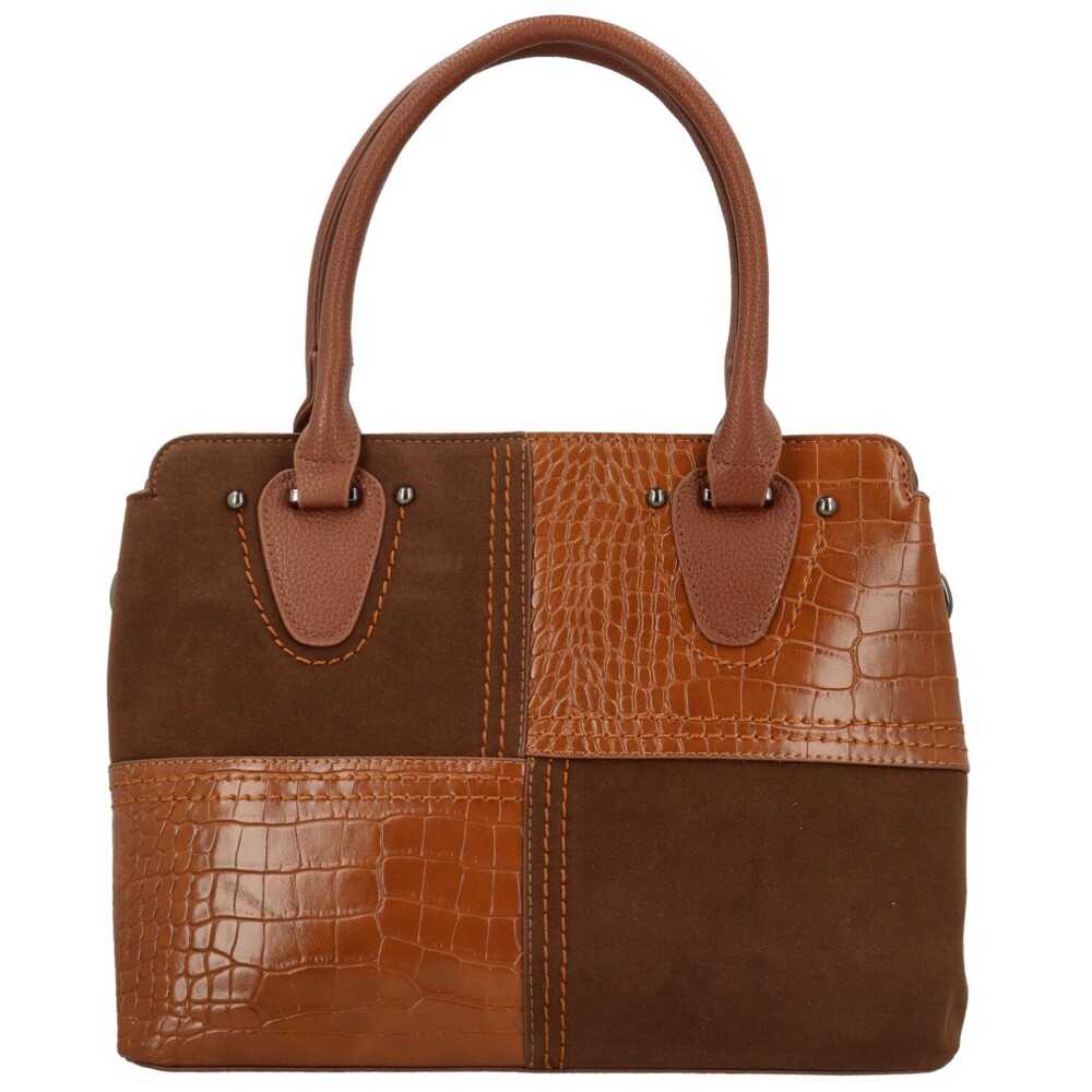 Elegantná koženková kabelka pôsobí moderne a zároveň nadčasovo. Prednú stranu zdobí originálna kombinácia hladkej, semišovo ladenej a štruktúrovanej koženky s krokodílím vzorom, ktoré sú zošité do obdĺžnikových blokov s ozdobným prešitím. Hornú časť dopĺňajú pevné uši uchytené kovovými cvočkami. Hlavné vrecko je uzatvárateľné na zips a vnútorný priestor je prehľadne rozdelený prepážkou na dve časti. V podšívke sa nachádzajú praktické vrecká na drobnosti. Zadná strana kabelky má zipsové vrecko. Kabelku dopĺňa dlhý nastaviteľný popruh na pripnutie a decentné strieborné kovanie, ktoré podčiarkuje jej elegantný vzhľad. Objednajte ešte dnes a vyskúšajte, vrátiť ju môžete až za 30 dní!