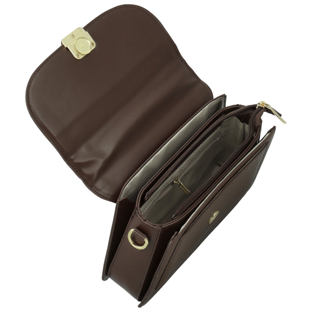 Štýlová malá koženková kabelka v kufríkovom prevedení. Zaoblená klopa skrýva hlavné vrecko na zips, vo vnútri doplnenú menšími vreckami v podšívke a otvorenými vreckami vpredu aj vzadu pre drobnosti. Pevné ucho umožňuje pohodlné nosenie v ruke, dlhý odnímateľný popruh zase premení kabelku na praktickú crossbody. Zlaté kovanie dodáva elegantný a sofistikovaný detail. Krásny doplnok pre ženy, ktoré hľadajú spojenie praktickosti, elegancie a nezameniteľného štýlu. Objednajte ešte dnes a vyskúšajte, vrátiť ju môžete až do 30 dní!
