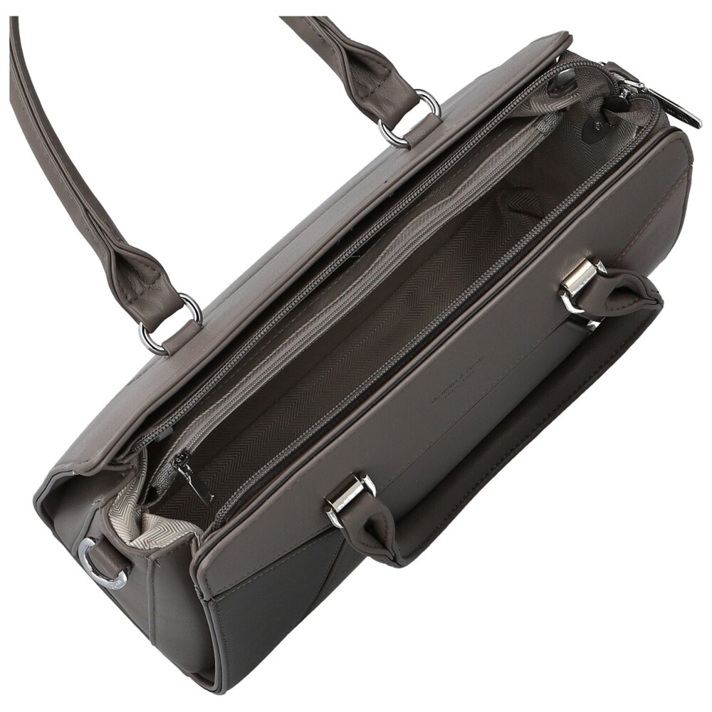 Štýlová koženková kabelka do ruky, ktorá pôsobí elegantne a zároveň moderne vďaka originálnemu tvarovaniu prednej strany. Dizajn tvorí jemné geometrické línie a precízne švy, ktoré dodávajú kabelke šmrnc a sofistikovaný vzhľad. Strieborné kovanie jemne kontrastuje s materiálom a podčiarkuje jej elegantný charakter. Hlavné vrecko je uzatvárateľné na zips a vnútorný priestor je premyslene rozdelený, nechýbajú vrecká v podšívke ani väčšie zipsové vrecko. Na zadnej strane sa nachádza praktické zipsové vrecko. Kabelku je možné nosiť v ruke alebo cez rameno vďaka prídavnému nastaviteľnému popruhu. Spodné kovové nožičky chránia dno pred odrením. Perfektná voľba pre ženy, ktoré hľadajú elegantný, ale funkčný doplnok na každý deň. Objednajte ešte dnes a vyskúšajte, vrátiť ju môžete až do 30 dní!