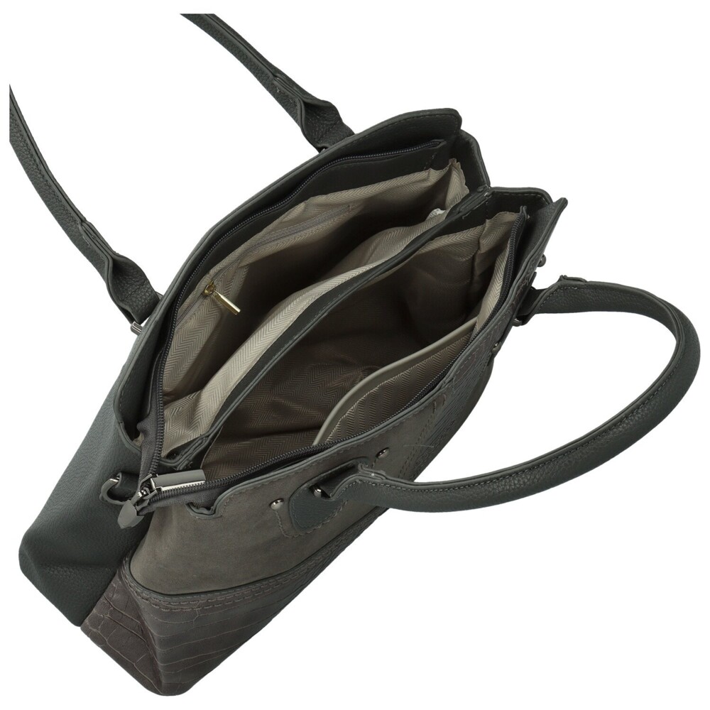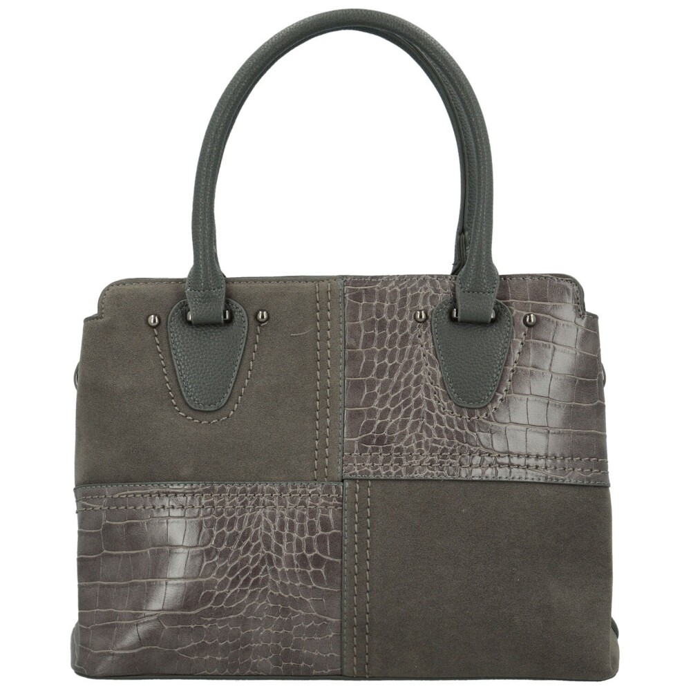 Elegantná koženková kabelka pôsobí moderne a zároveň nadčasovo. Prednú stranu zdobí originálna kombinácia hladkej, semišovo ladenej a štruktúrovanej koženky s krokodílím vzorom, ktoré sú zošité do obdĺžnikových blokov s ozdobným prešitím. Hornú časť dopĺňajú pevné uši uchytené kovovými cvočkami. Hlavné vrecko je uzatvárateľné na zips a vnútorný priestor je prehľadne rozdelený prepážkou na dve časti. V podšívke sa nachádzajú praktické vrecká na drobnosti. Zadná strana kabelky má zipsové vrecko. Kabelku dopĺňa dlhý nastaviteľný popruh na pripnutie a decentné strieborné kovanie, ktoré podčiarkuje jej elegantný vzhľad. Objednajte ešte dnes a vyskúšajte, vrátiť ju môžete až za 30 dní!