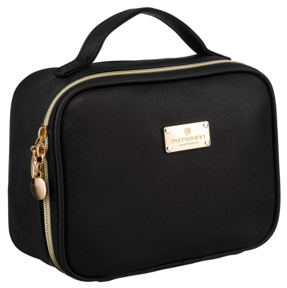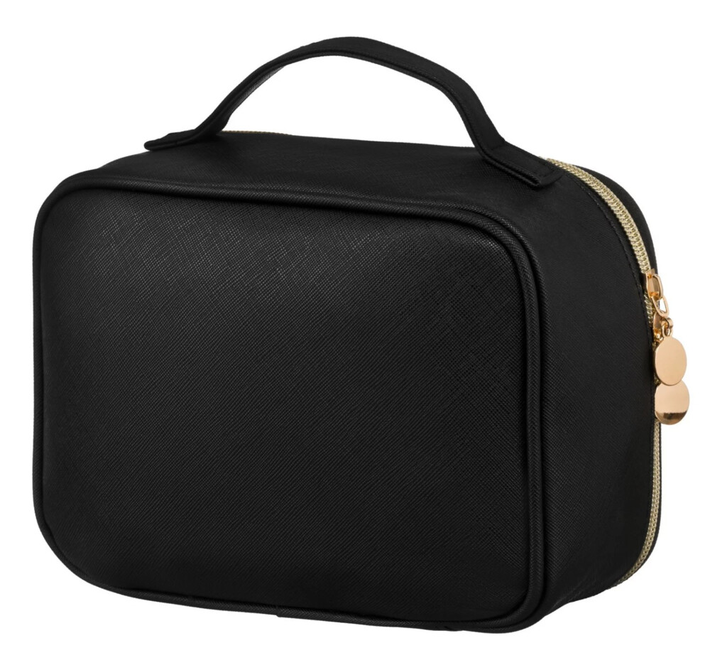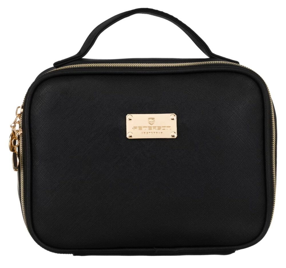 Štýlová dámska kozmetická taška s praktickým uchom pre ľahké prenášanie zaujme svojim elegantným vzhľadom. Prednú stranu zdobí decentné logo značky, ktoré dodáva taštičke nádych luxusu. Jednokomorový dizajn poskytuje pohodlie a dostatok priestoru, čo umožňuje organizované uloženie potrebnej kozmetiky a doplnkov. Hlavné vrecko je zaistené zipsami a zdobené okrúhlymi príveskami v zlatej farbe. Vnútri tašky sú štyri praktické priehradky určené pre štetce na make-up, ktoré sú zaistené širokou gumičkou na udržanie vecí na mieste. Praktická, elegantná a ženská taštička, ktorá spája štýl aj funkčnosť. Objednajte ešte dnes a vyskúšajte, vrátiť ju môžete do 30 dní!