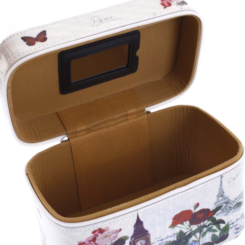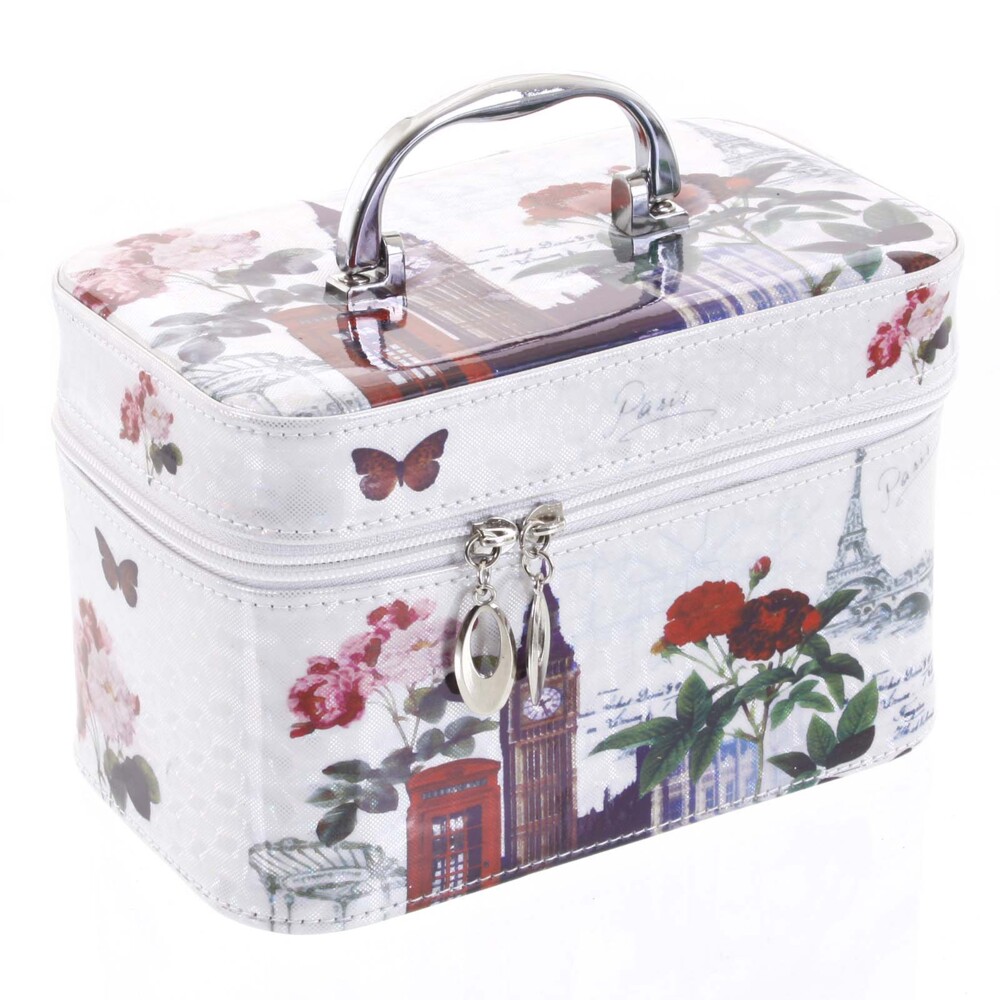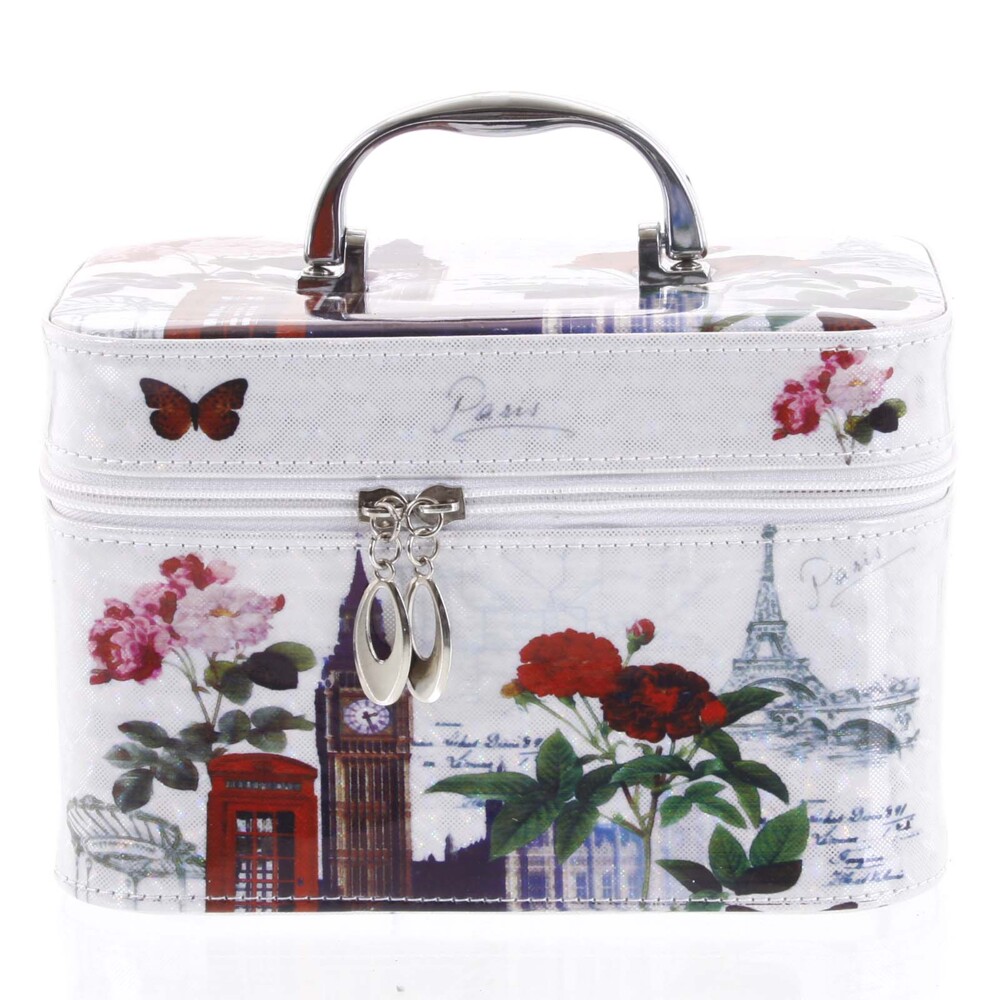 Novinkou na našom eshope je praktický kozmetický kufrík veľkosti "M". Ak sa rada skrášľujete, tento krásny bielo červený kufrík na kozmetiku s motívom Paríža a Londýna Vám nesmie chýbať! Dajte zbohom preplneným kozmetickým stolíkom a skrinkám v kúpeľni. Do taštičky si uložíte líčidlá, laky na nechty, parfumy a ďalšie kozmetické potreby. ✅ Kufríky sú skvelé aj pri cestovaní! Celkom ponúkame tri veľkosti, vnútorné usporiadanie je u každého mierne odlišné. Pri tomto kufríku máte k dispozícii strieborné madlo na prenášanie a zapína sa duálnym zipsom. Vnútorný priestor je menší, vystačí Vám na potrebnú kozmetiku ako sú líčidlá, osobné drogérie, prípadne aj menšie kefa na vlasy. Využiť môžete aj malého vyberateľného zrkadla. Celkovo je pevný, hladký as odleskom, má oblé rohy.