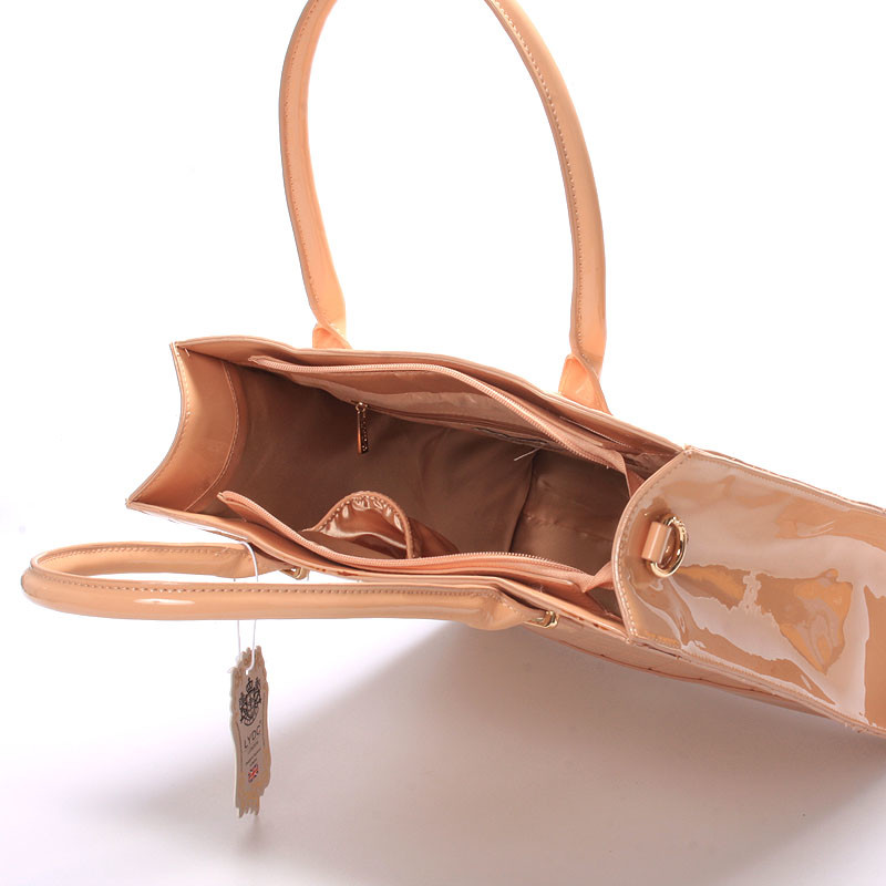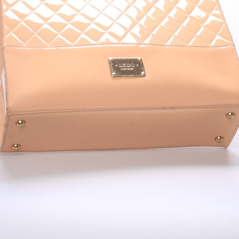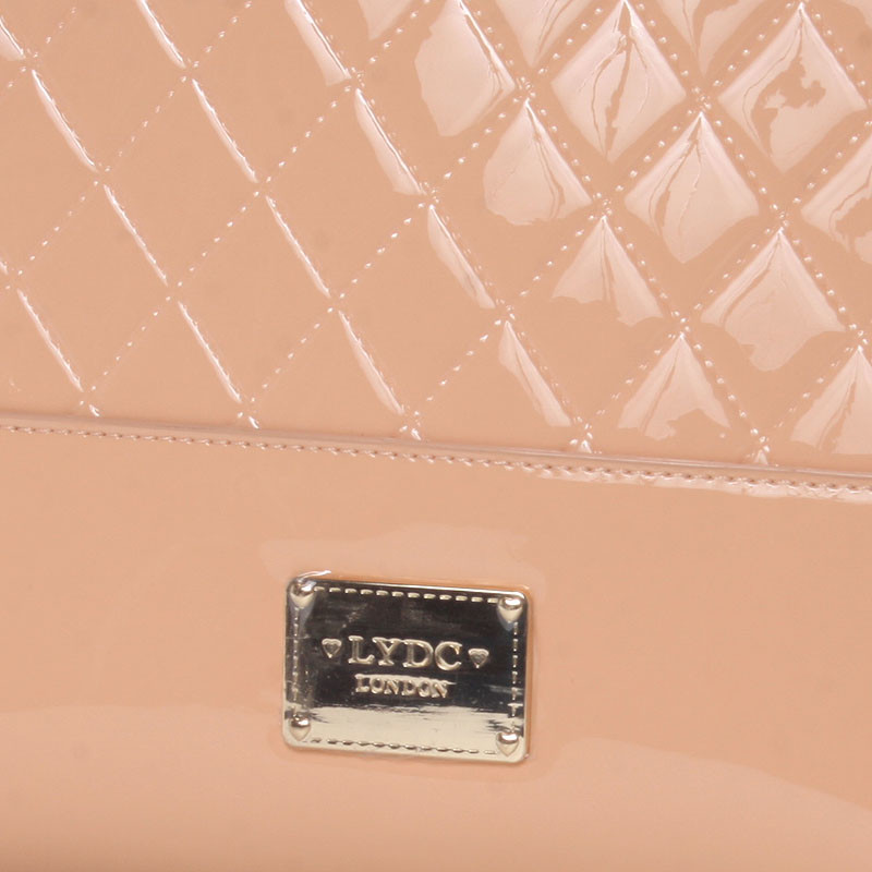 Elegantná púdrová kabelka LYDC prešívaná a s lakovaným povrchom. Kabelka je z pevného materiálu a držia svoj tvar. Vnútri je nedelený priestor s kapsičkami a púdrovú podšívkou. Kovové čítať sú v zlatej farbe a s logami LYDC.